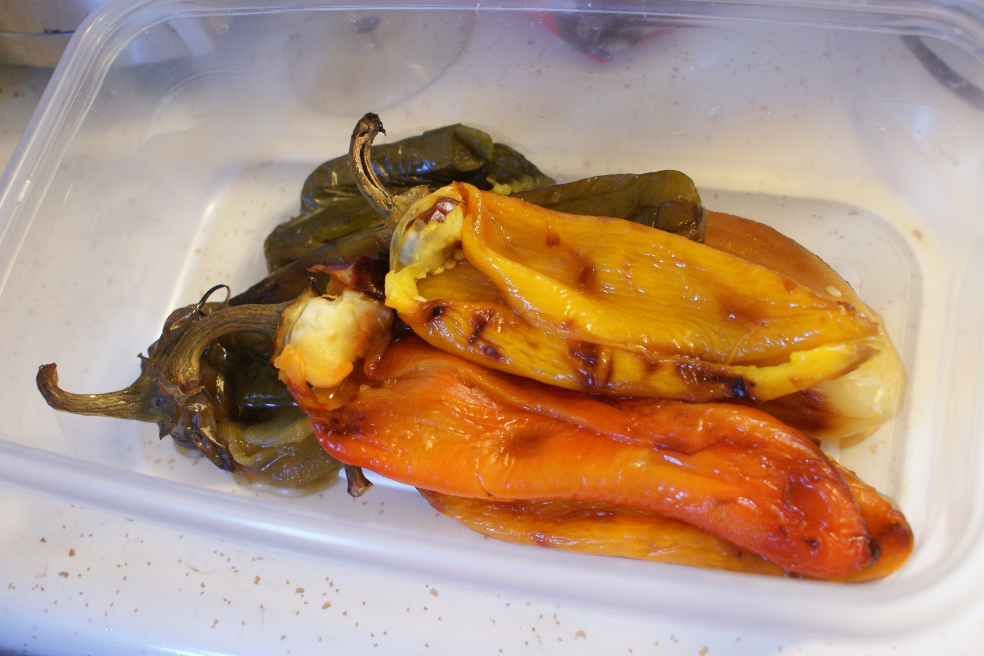 Funnily enough, one big red pepper was somehow missed in the sink when I went to roast the others during naptime, so it got the more direct fiery treatment at the last minute. It held up much better.
