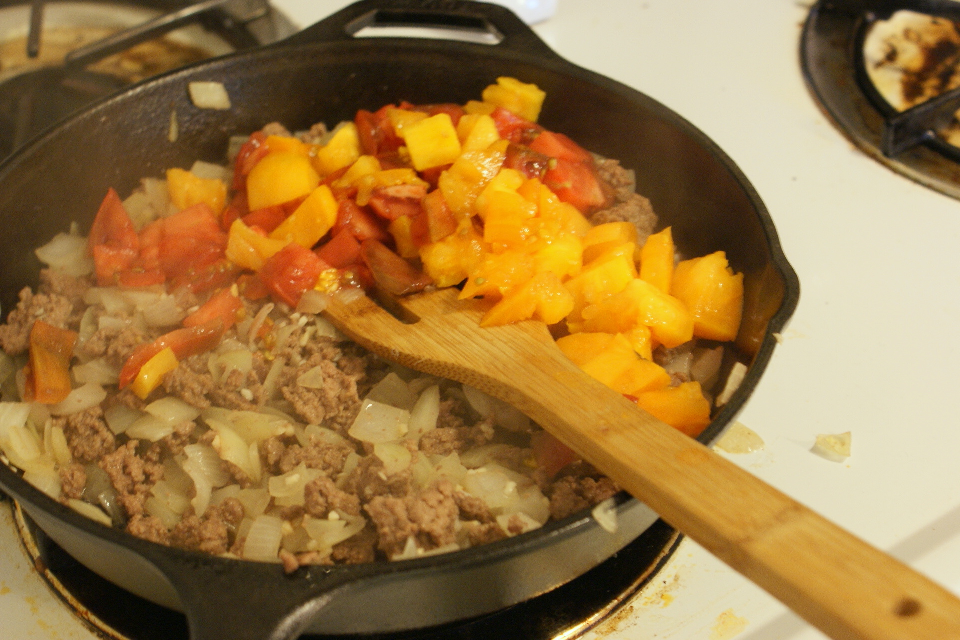I had at the time four different types of tomatoes to work with: the juliettes (in the back), a bunch of nice canners from our patch in the community garden (toward the back mixed with the cleaner-looking juliettes), and some beautiful slicers from week #19 that were threatening to go bad (foreground).