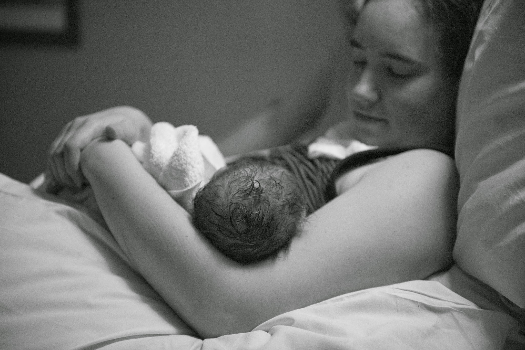 One more big, rather weird push, and she was out. They put her through my legs so I could see her under me for a moment. My vision was clear, and I could see her big head of hair and squishy face. Mercifully, I was soon on my back with her on my chest. They didn’t have to suction her, and I had all her slimy goodness on my chest for a nice long time.