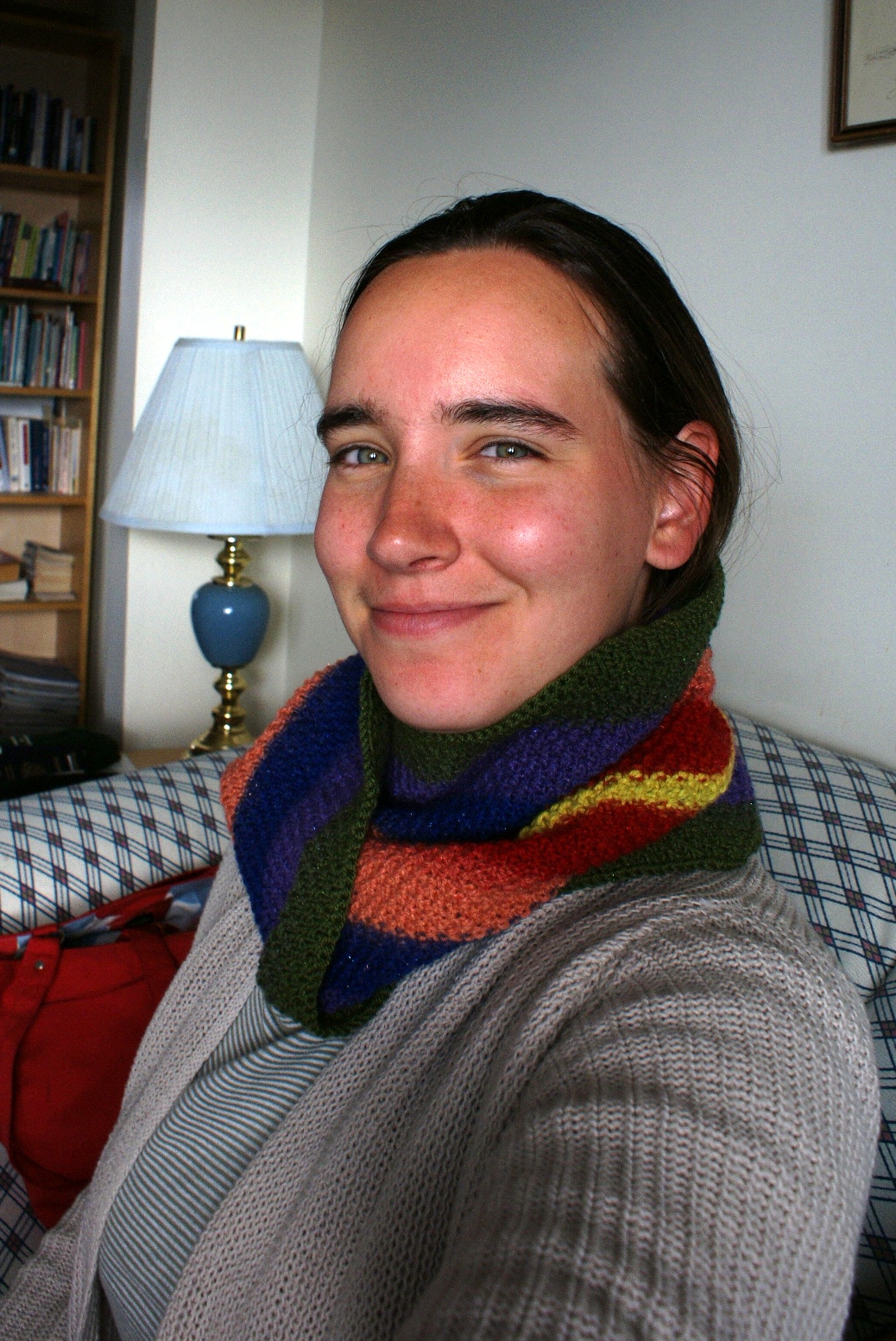 I definitely miscalculated on size; to get the cowl I wanted, I should have cast on many more stitches. I suppose this is because the half-twist takes away some of the circumference, and the gauge was smaller than I expected. Still, it nestles perfectly around my neck, the twist making it a little smaller in front. It’s so wide that it can be pulled up into a hood in a pinch, but it’s not too bulky when worn normally.