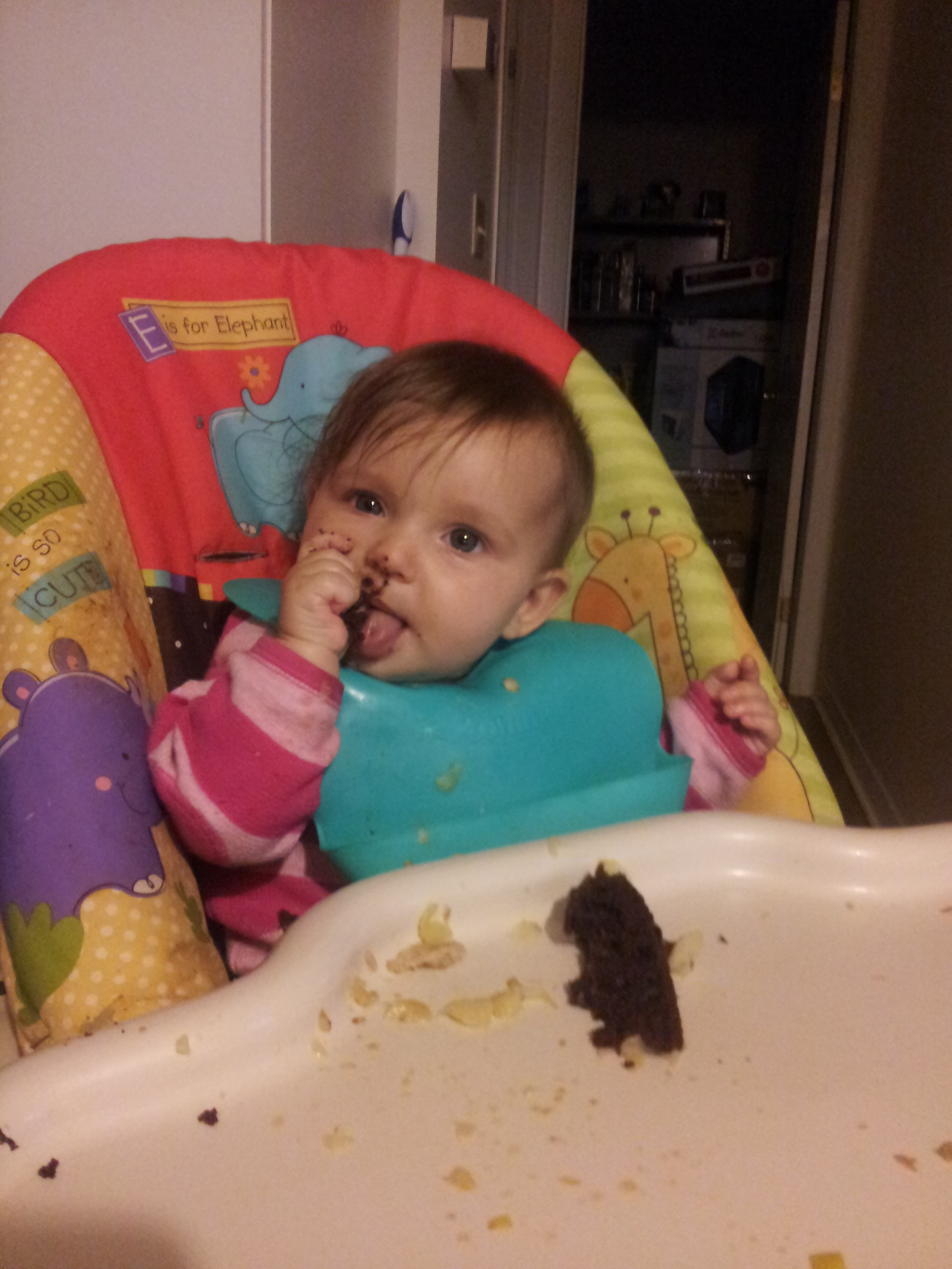 For dessert, there was one hilarious idea that we had to add to make our Michaelmas celebration complete. The idea: Make devil’s food cake, then stab it with cocktail swords to commemorate St. Michael casting the Devil out of heaven. We couldn’t find cocktail swords, but we did have N stab her piece of cake a few times before she ate it.