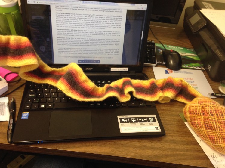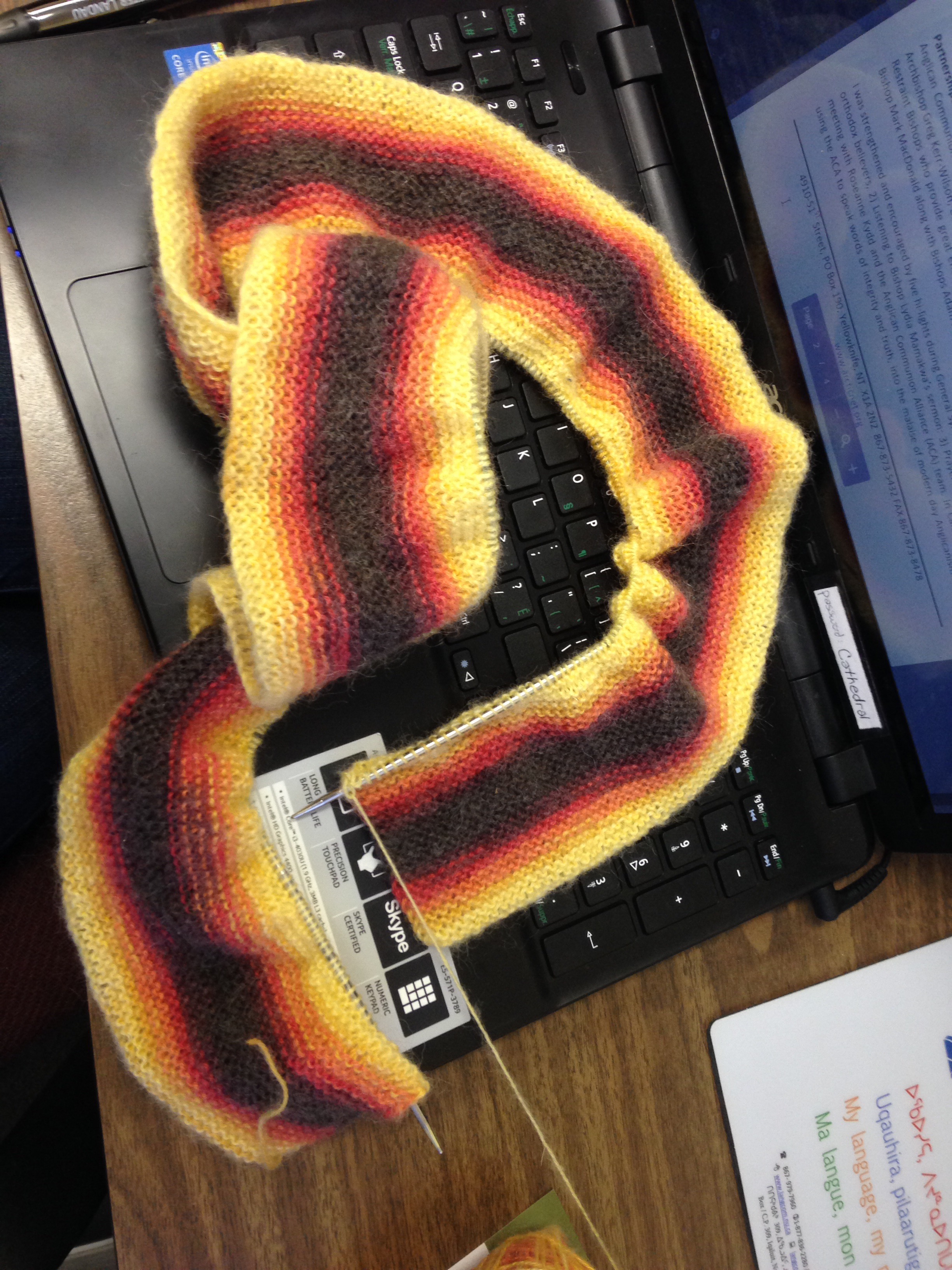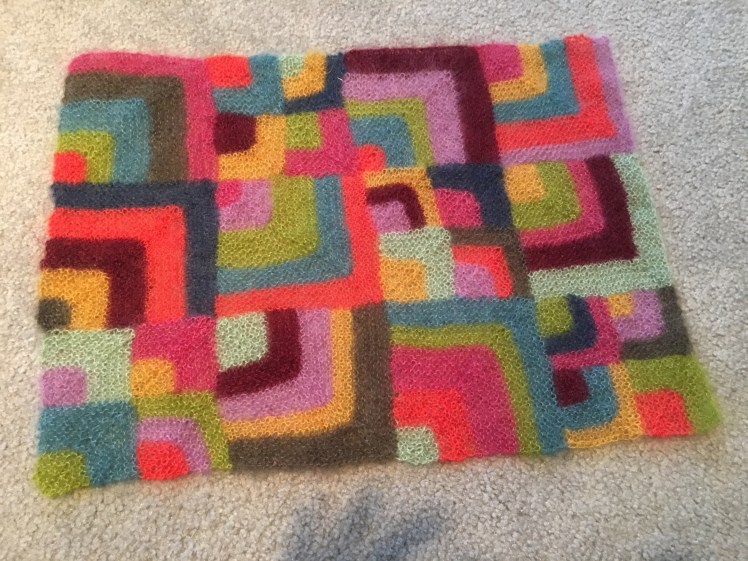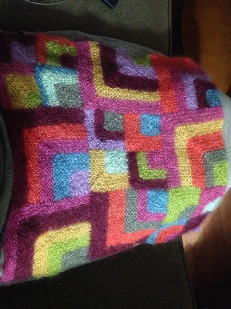 So much for finished fuzzies. I’ve made a lot of progress on the mitered square stole as well. I’m always catching up to Mum, who has more knitting time than me, but I feel like I’m getting into a groove. I enjoy texting pictures back and forth as it grows.