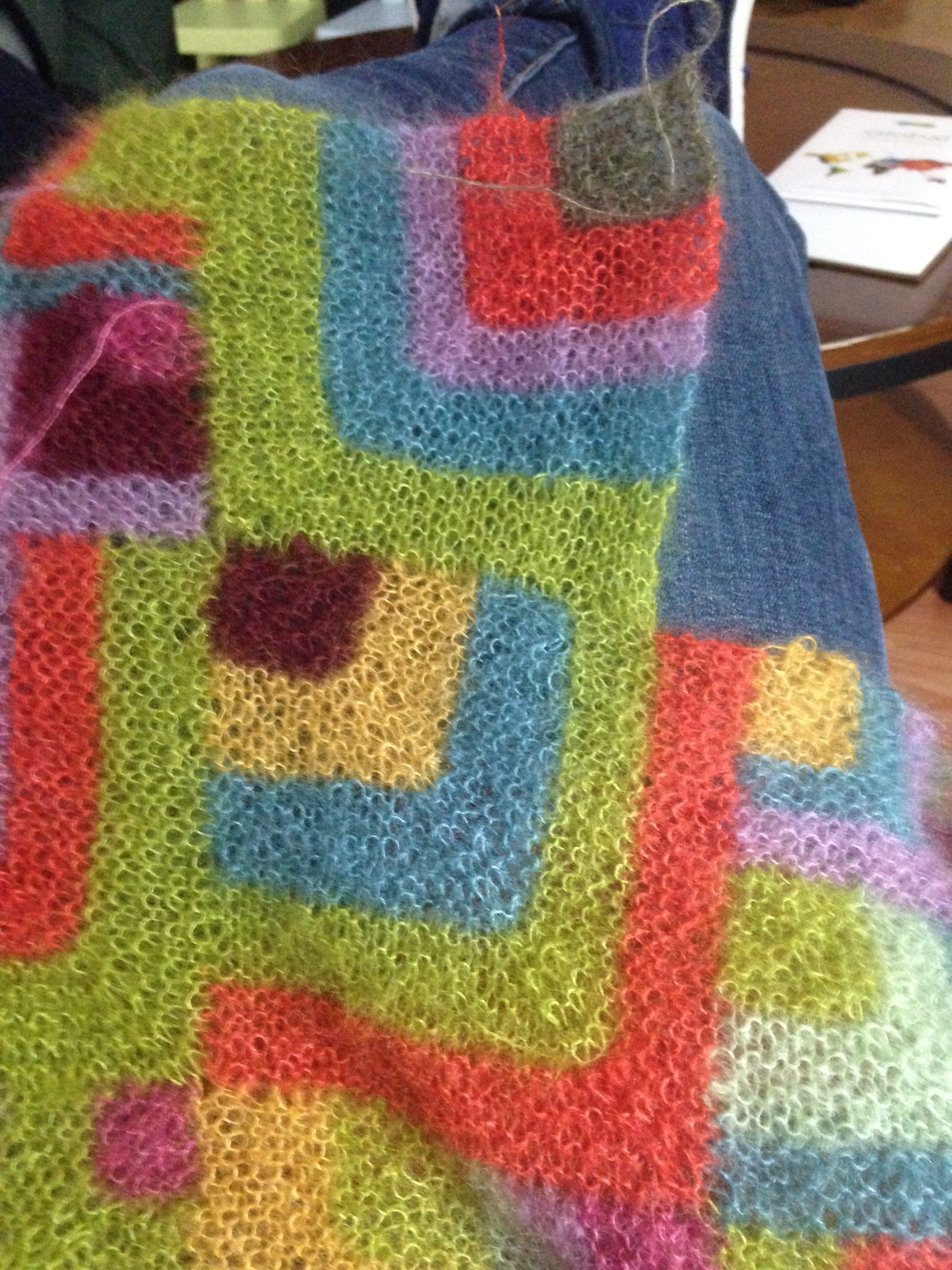 It’s funny: lots of color changes are what make this shawl fun, both to knit and to look at, but they are also the most annoying thing about it. At least I’ve worked out how to weave in nearly all the ends in as I go, so I only have six ends to weave in at the end of a row of squares instead of 40. That’s not an exaggeration. There are literally 20 color changes in a row of squares, and you have to weave in both ends.