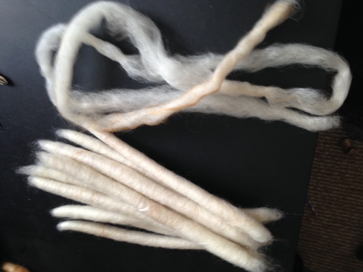 Above you can see an attenuated puni next to intact punis, for length comparison. They just sort of explode into puffy loveliness when you stretch them out, though there were some points where the fibers knotted into a tiny chokehold. I blame that on my stash habits; they were perfectly packaged in tissue paper and plastic, but compacting is a little inevitable over that length of time.