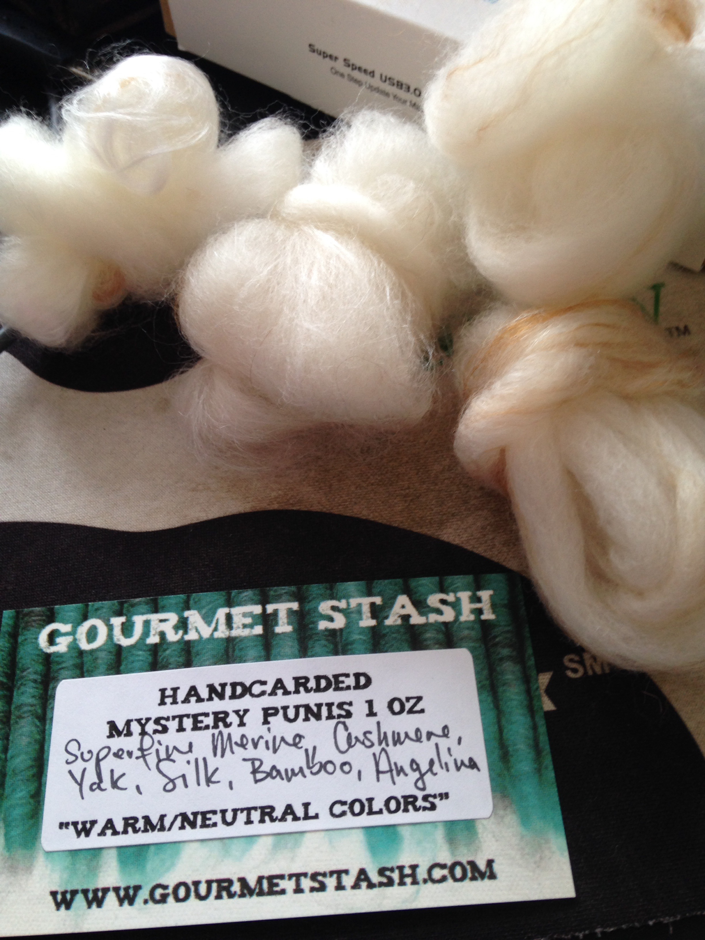 Back at the Yarn Party, I bought a mystery package of punis from GS. The idea is, since you’re buying blind, you can save a few buckzoids and have a nice surprise. This last week I’ve needed something short to tide me over while I waited for my handcards to arrrive in the mail, so I pulled out these pretties and started pulling them apart.