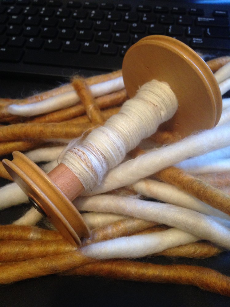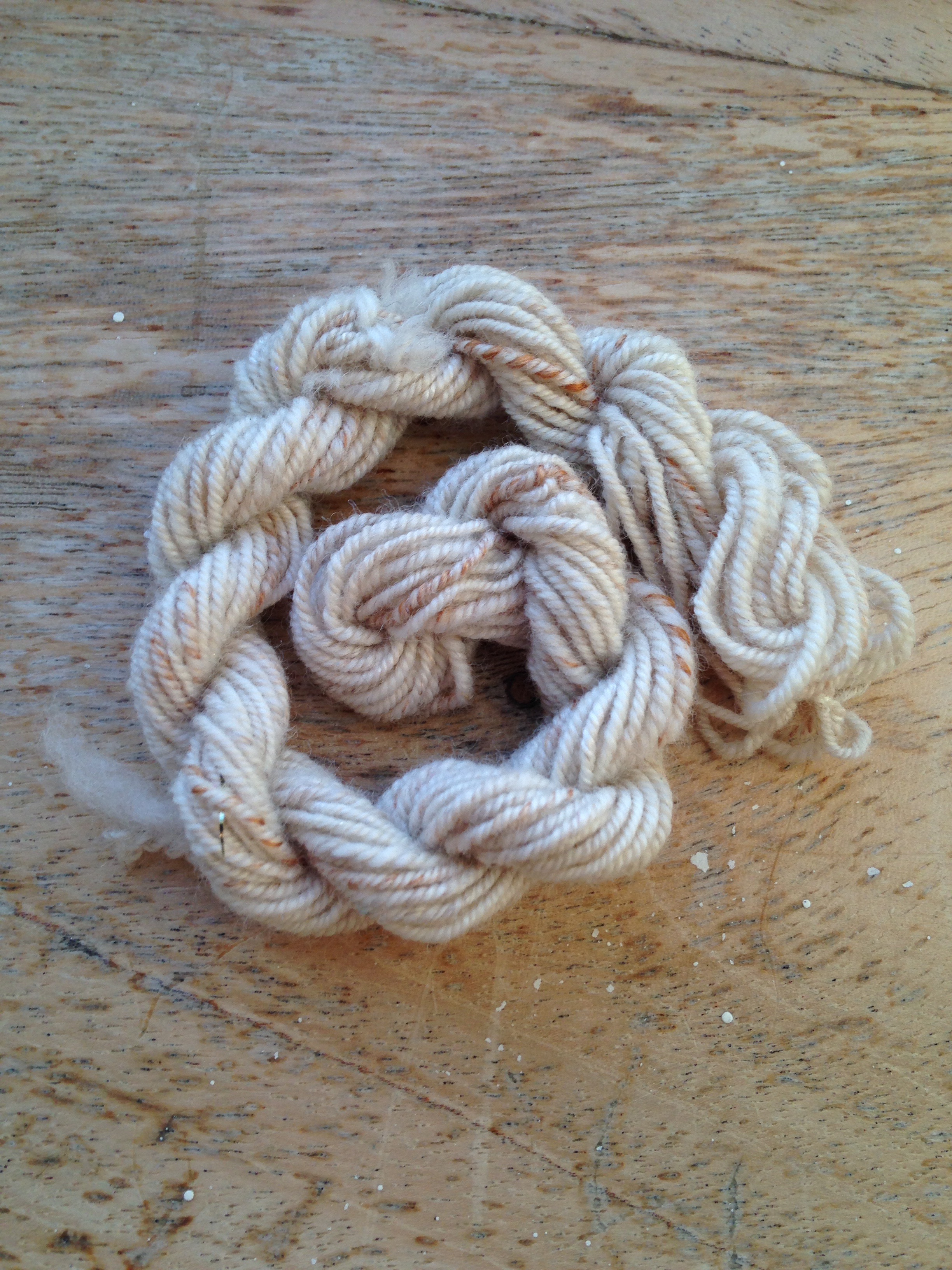 I wound them into little nests the size of a Kinder Egg and started spinning. Short forward draw, 1″ draft, 15:1 ratio. (How happy I am that my fastest ratio works now! Turns out all it took was a better drive band. Hemp twine rather than dishcloth cotton. Sheesh.)
