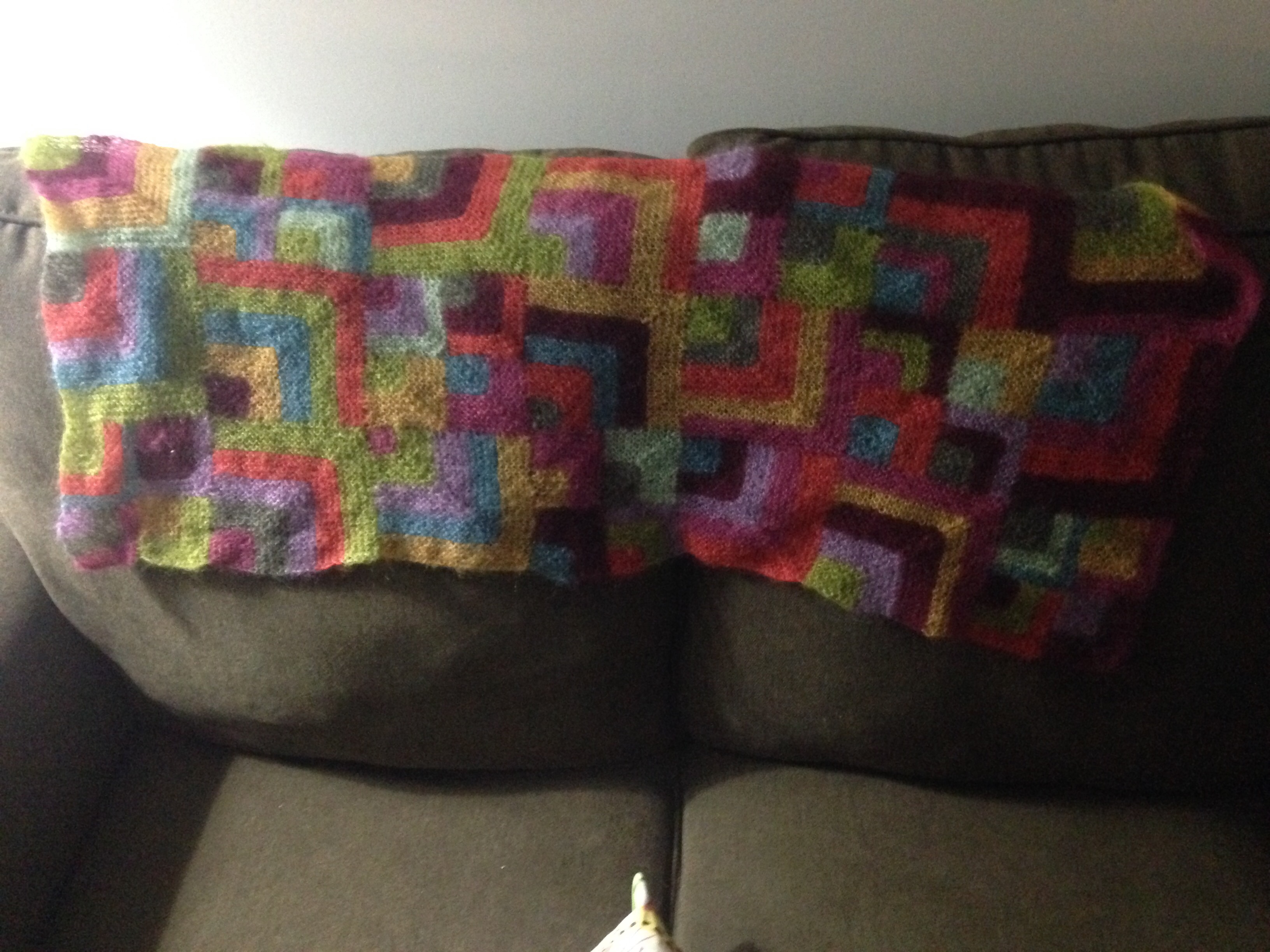 The squares are all finished, and the ends are all woven in, but I am still trying to decide whether I am finished or not. The question is, whether to put on a border. Mum is probably going to sew it into a poncho shape and add a small border; I am considering putting a border of some kind around the whole thing. I resisted this idea at first because I thought it would look like a picture in a frame, which didn’t make sense to me. However:
