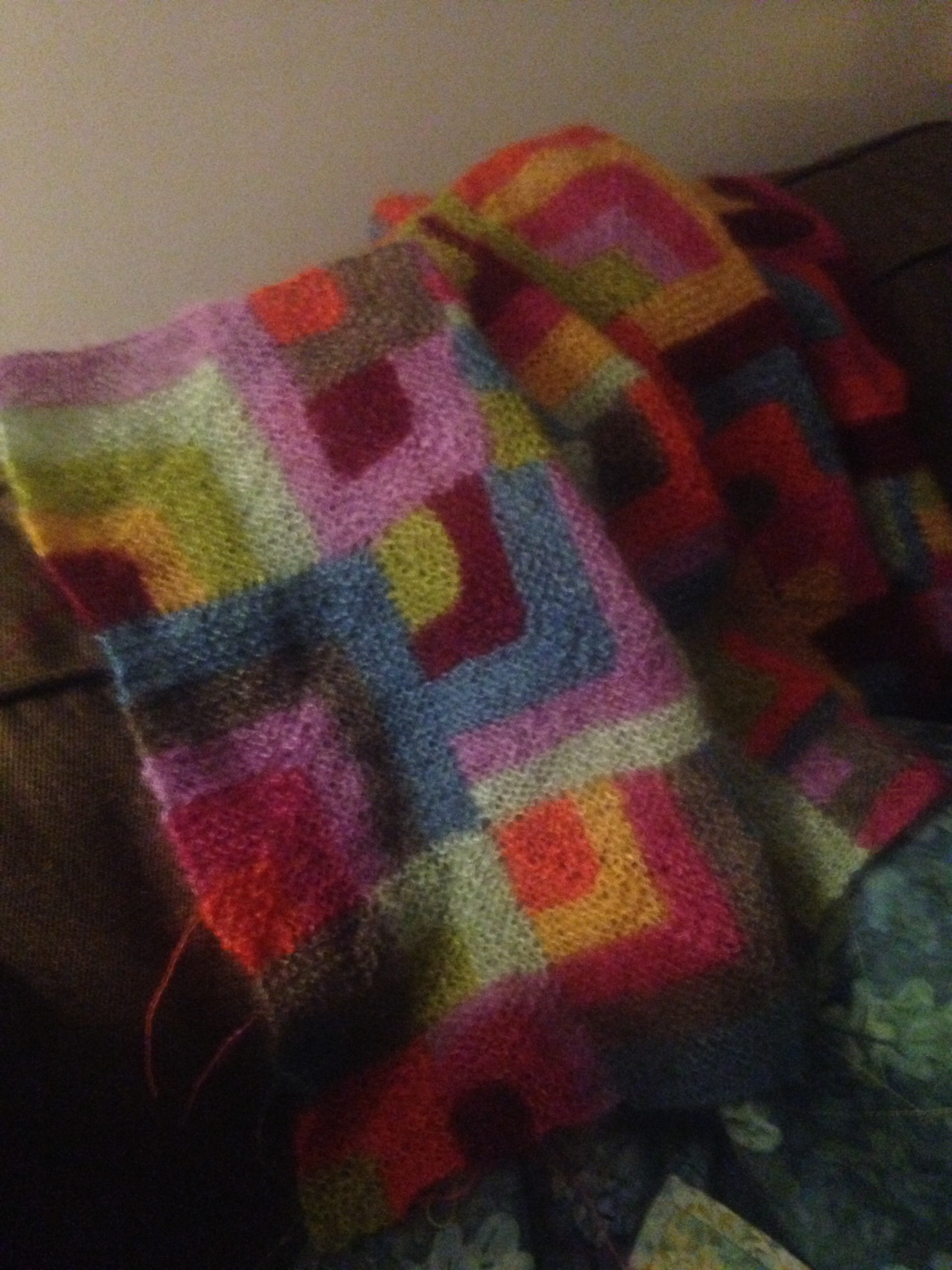 I wore it to teach last night, and it was fabulously bright and warm. It stretches a lot, so I don’t know that the messy border is noticeable. I wonder if a border would break up the impressionistic effect of all those dots and squares.