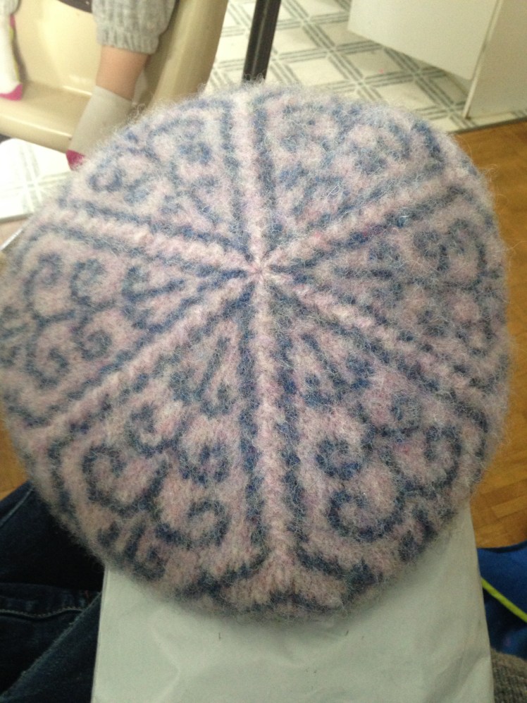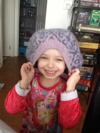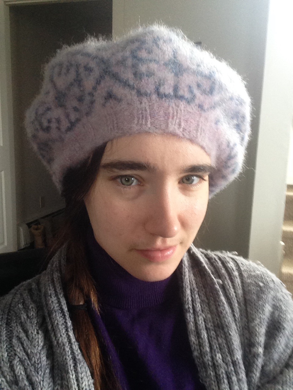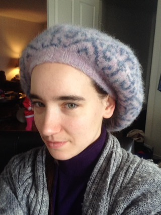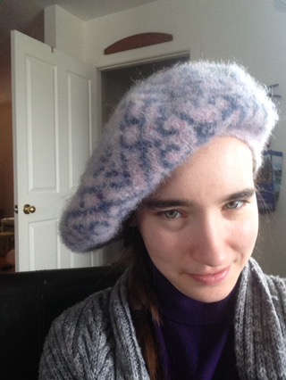 Much, much, much more reasonable! And with a wonderful halo that is extremely fetching and very soft. It can be worn as a beret, or more as a slouchy hat: