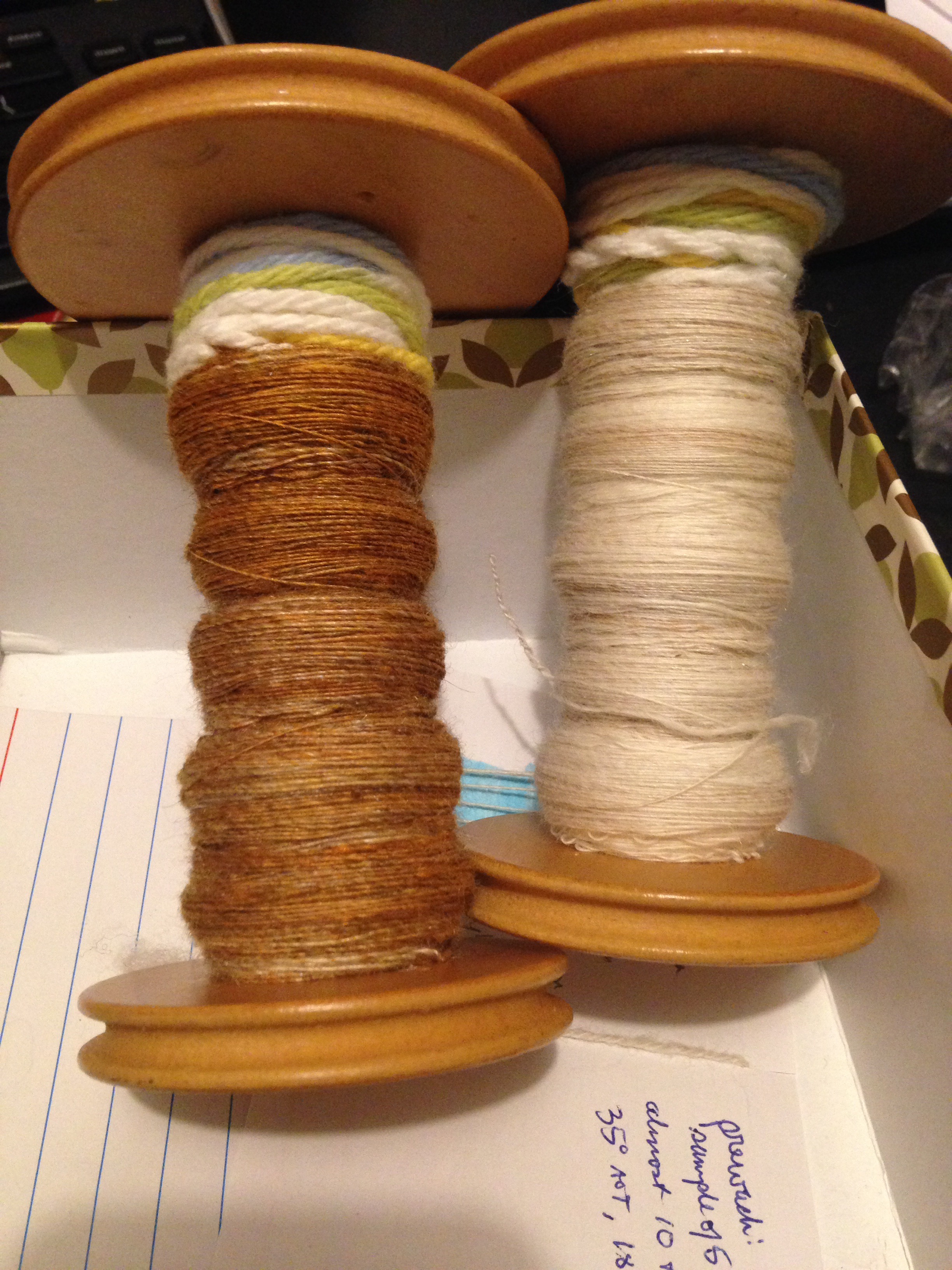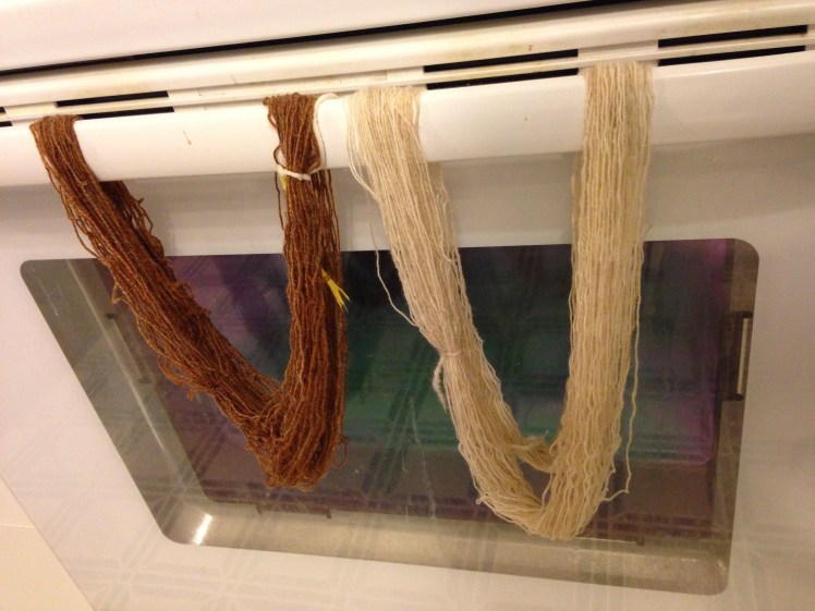 Having spun and plied these two colors, I think I was probably right about there being mostly superfine merino in the white punis. However, the brown is quite different. I spun them exactly the same, or at least as much the same as I’m capable of. The white is sprongy, fine, and happy. The brown is slightly thicker, over-energized, and ropey. You can see the difference in the picture below, straight off the niddy noddy. Looking at that list of ingredients, I’m not sure what else the brown could be? This is one mystery that will probably go unsolved.
