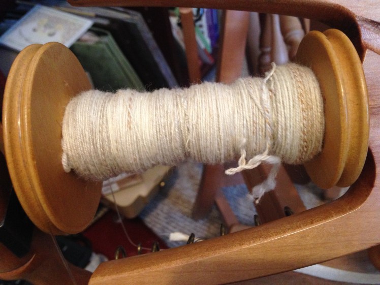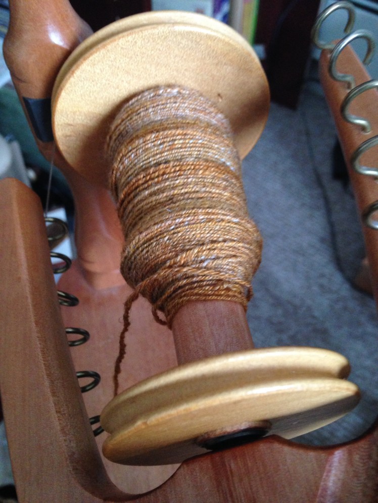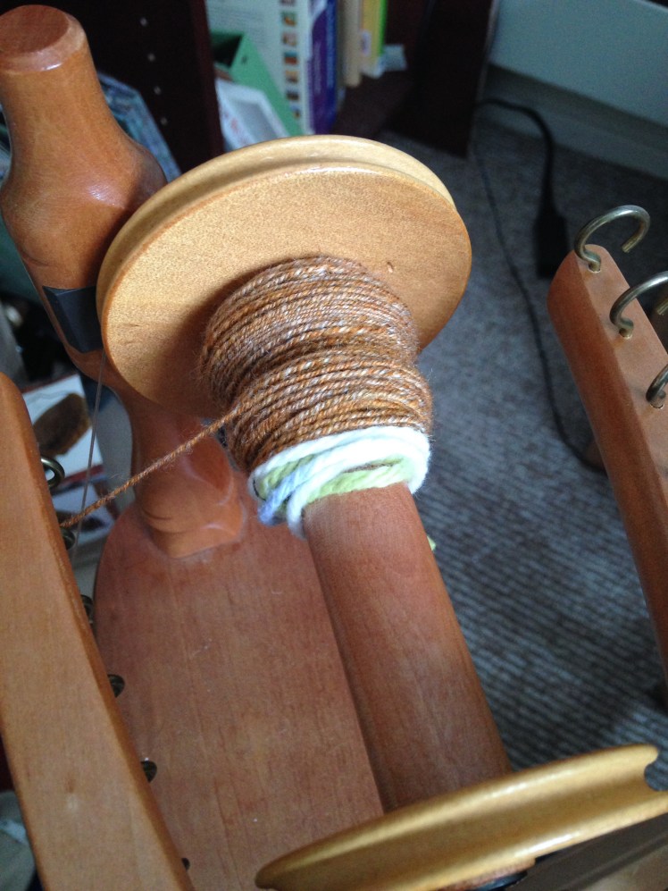 But how to ply? I’ve read far enough in Beth’s book to get a little bit of the math for calculating ply, so I ran with that: 8 tpi for the ply, or a little more than half the singles twist. Of course, I realized halfway throughplying that that calculation probably only applies to 2-ply. I haven’t read far enough to know if that’s right for 3-ply or not.