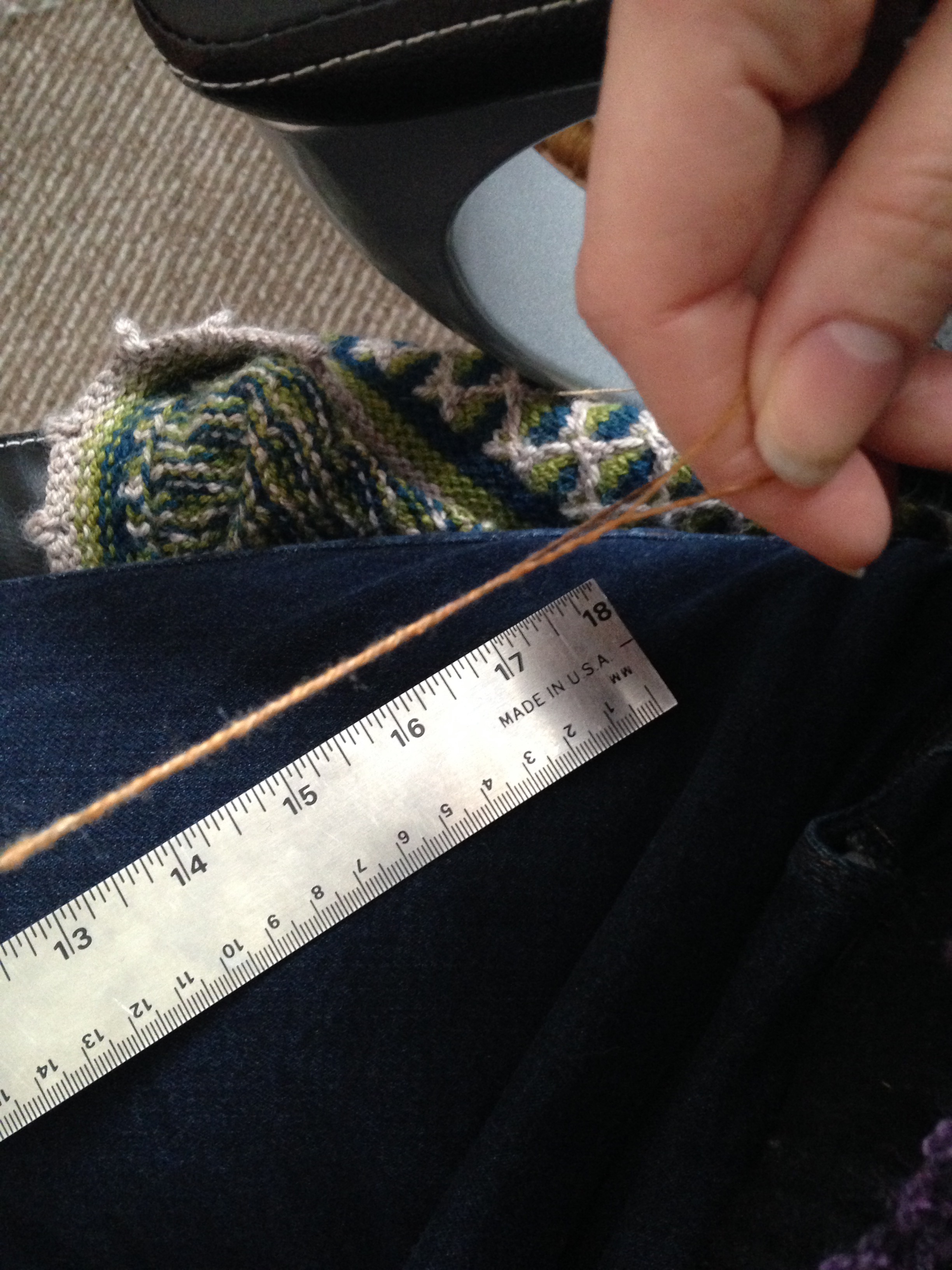 I got into my own groove with Navajo plying; by the end it was downright enjoyable. I have my own variation on Sarah Andersons YouTube video. It’s very handy to be spinning in a large office chair with armrests to help me position my arms without too much strain. I have this handy 18″ ruler that N found at the thrift store that lays nicely across my lap to measure my lengths precisely.