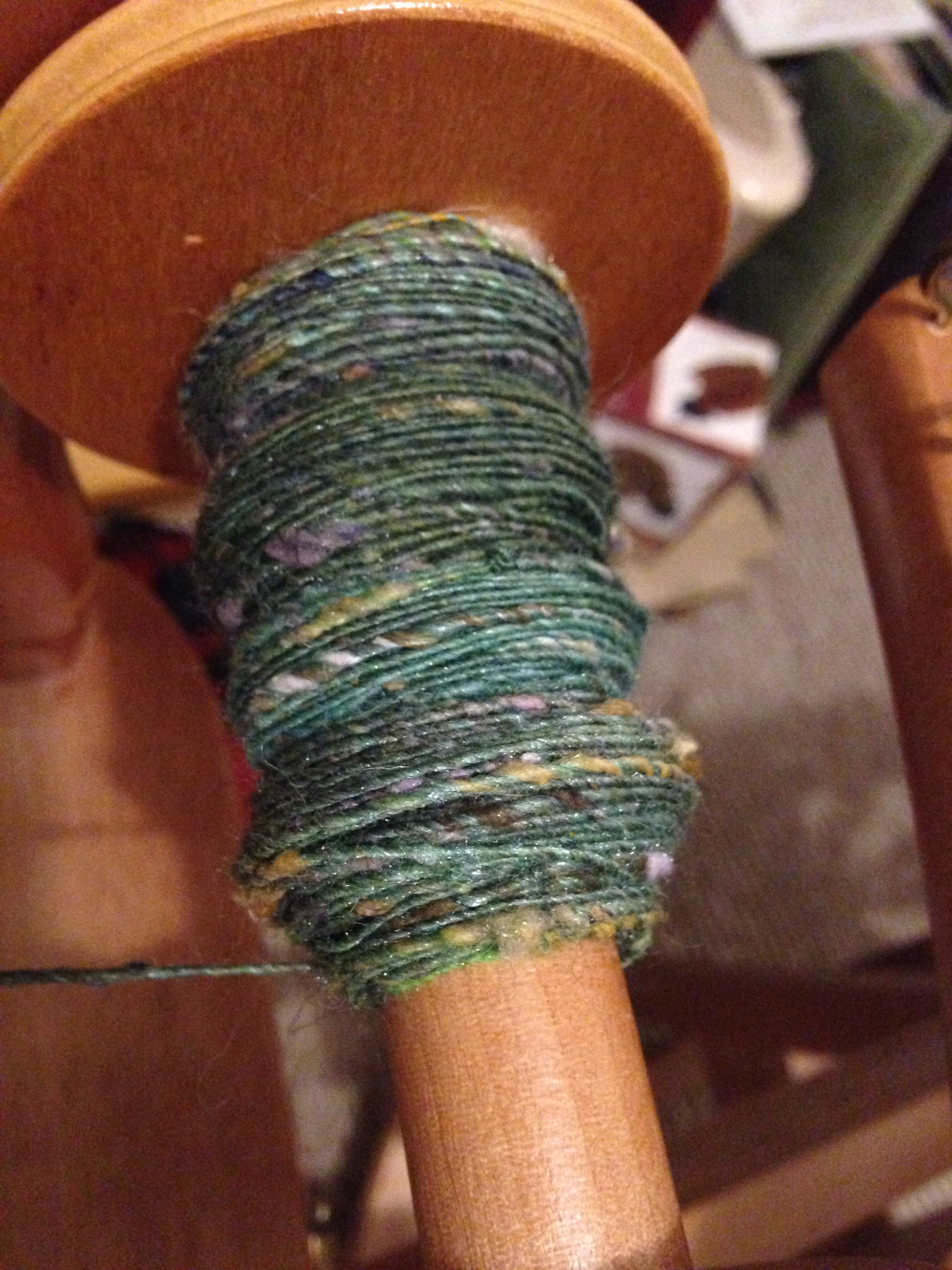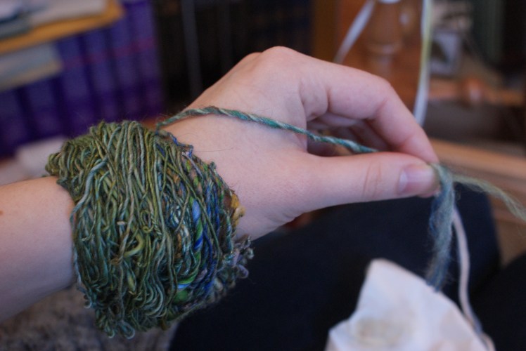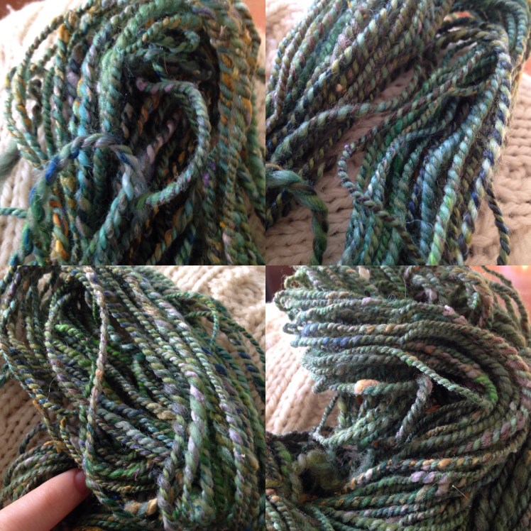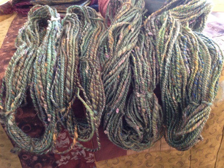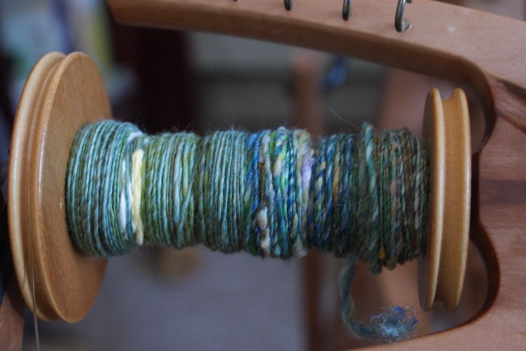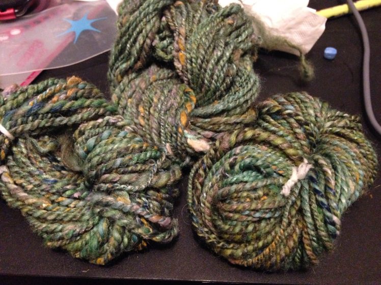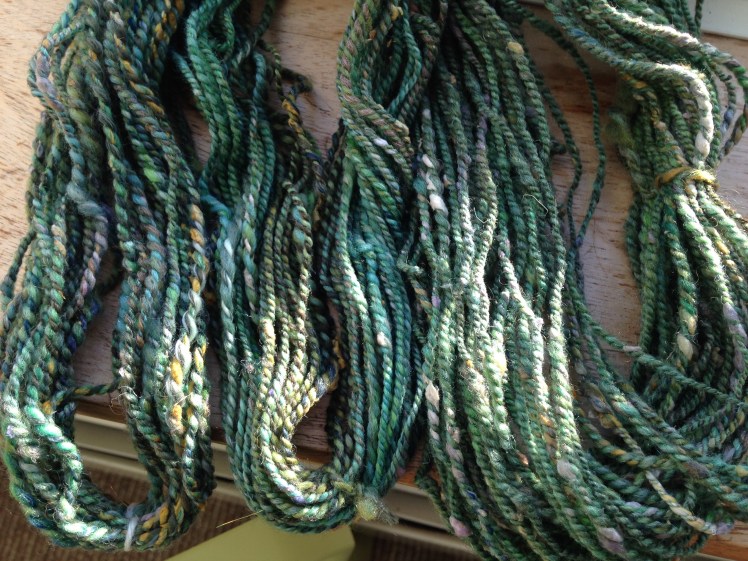 I tried to spin the singles evenly, but did not try to control the silk noil very much. I let them pop out and do their thing. The blending on handcards definitely made dealing with them a little easier – a big plus.