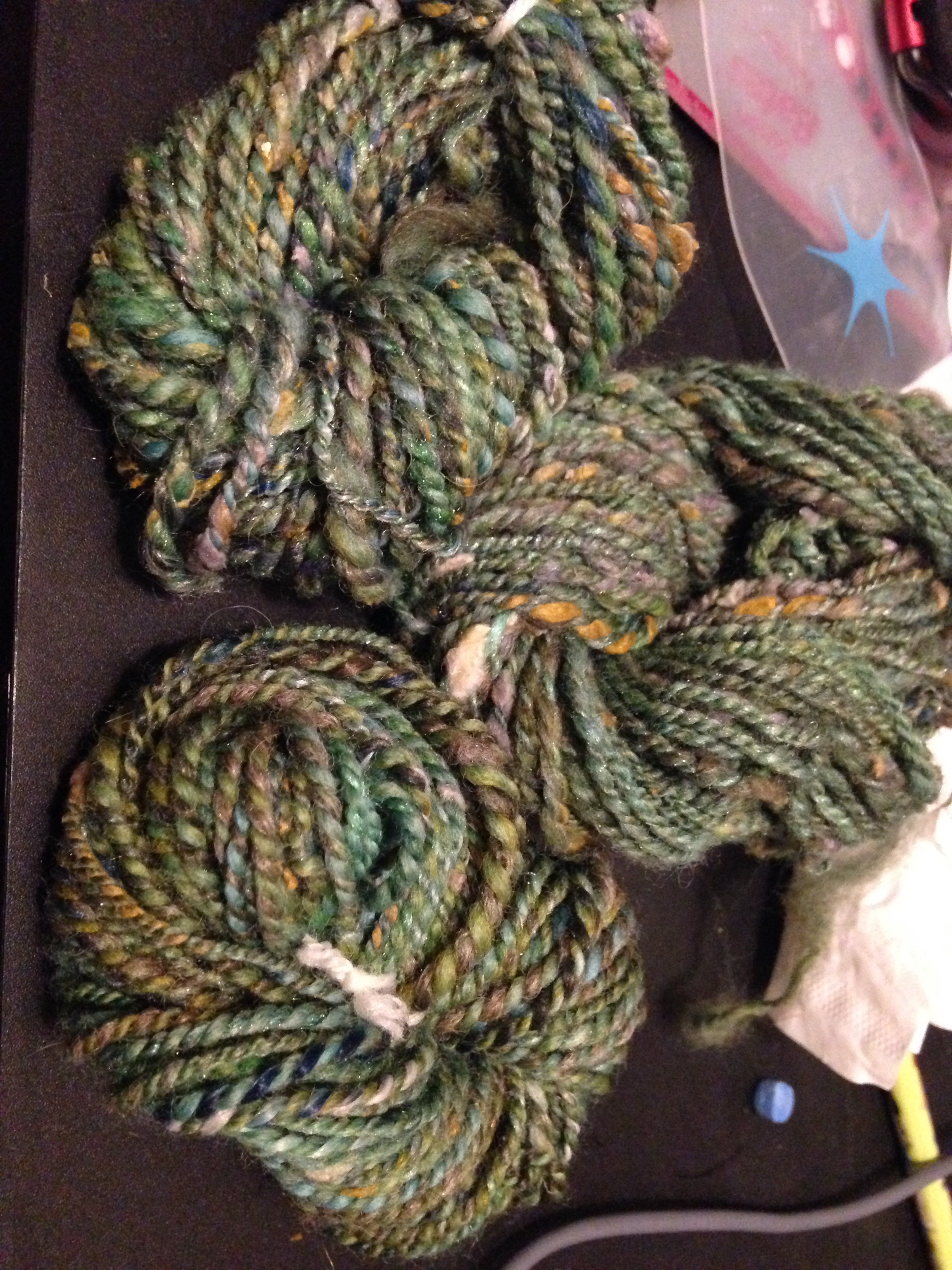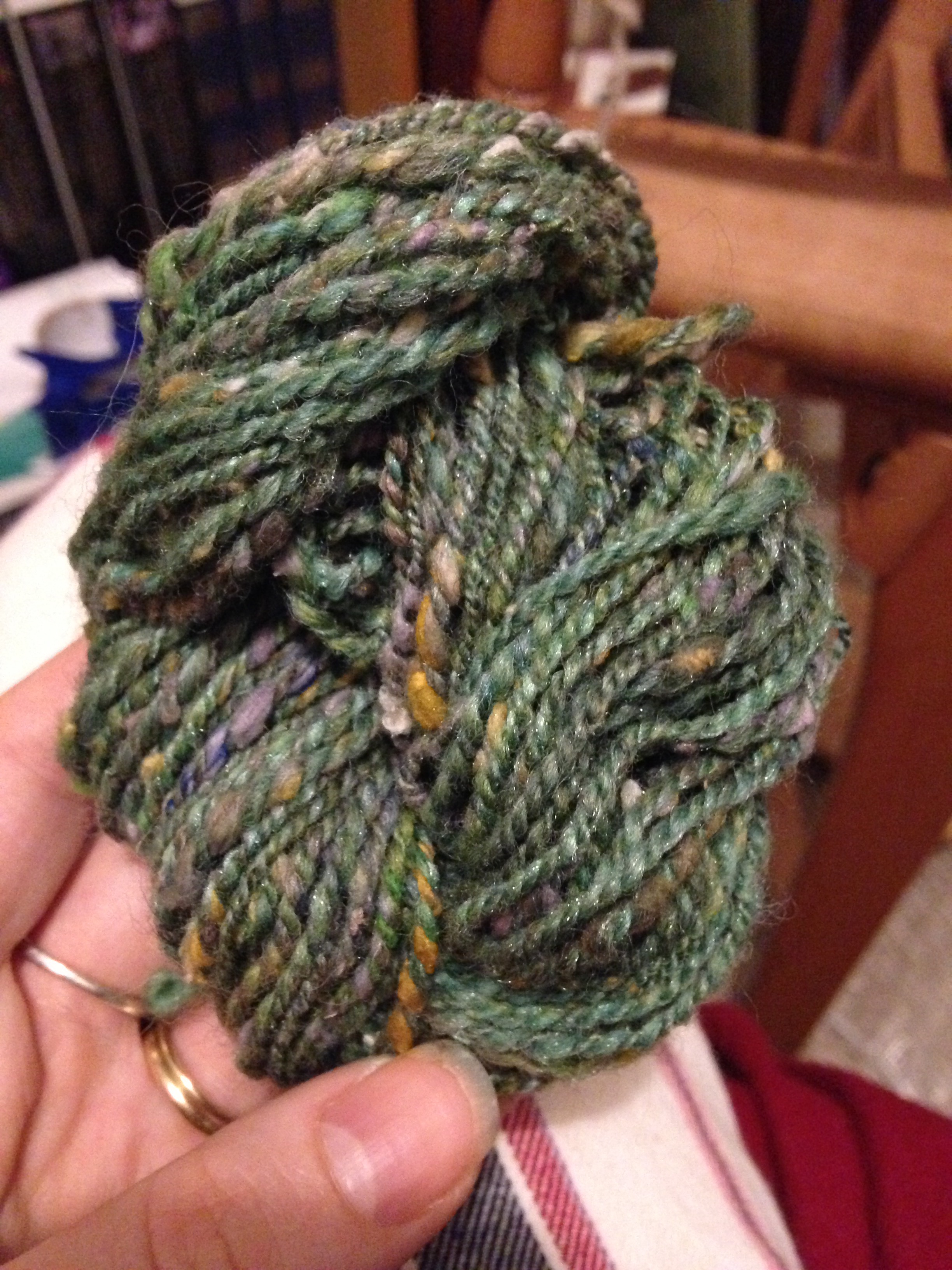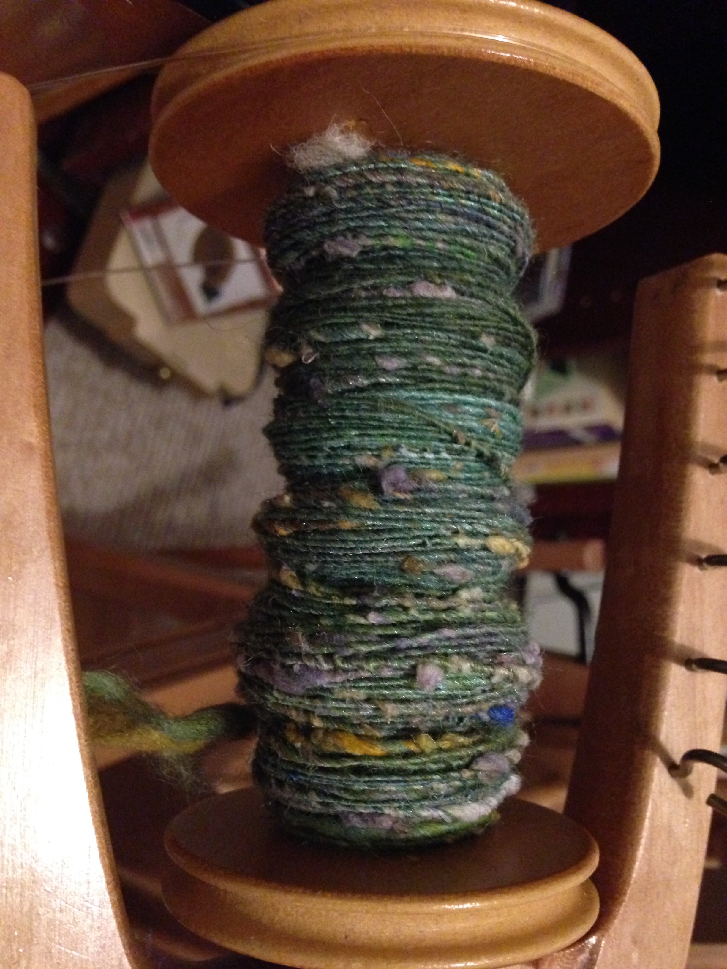 I tried to spin the singles evenly, but did not try to control the silk noil very much. I let them pop out and do their thing. The blending on handcards definitely made dealing with them a little easier – a big plus.