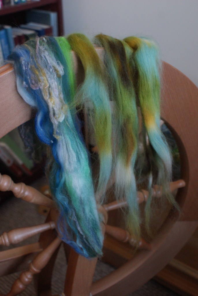 To spin, I arranged them mirror-wise based on how much I was blending: no blending first and last, most blended in the middle – so that, when I plied from a center-pull ball, the most-blended and least-blended portions would match up. I’d have to knit the yarn up to see if there was a difference, of course.