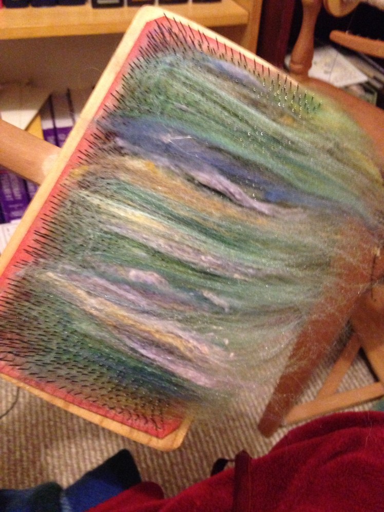 My next thought was, maybe I should try prepping the fibers with handcards. Not necessarily fully carding them, just using the cards to make the fibers play a little nicer together, by stretching out some of those blobs of silk noil, and making sure I had an equal amount of Polwarth in the mix.