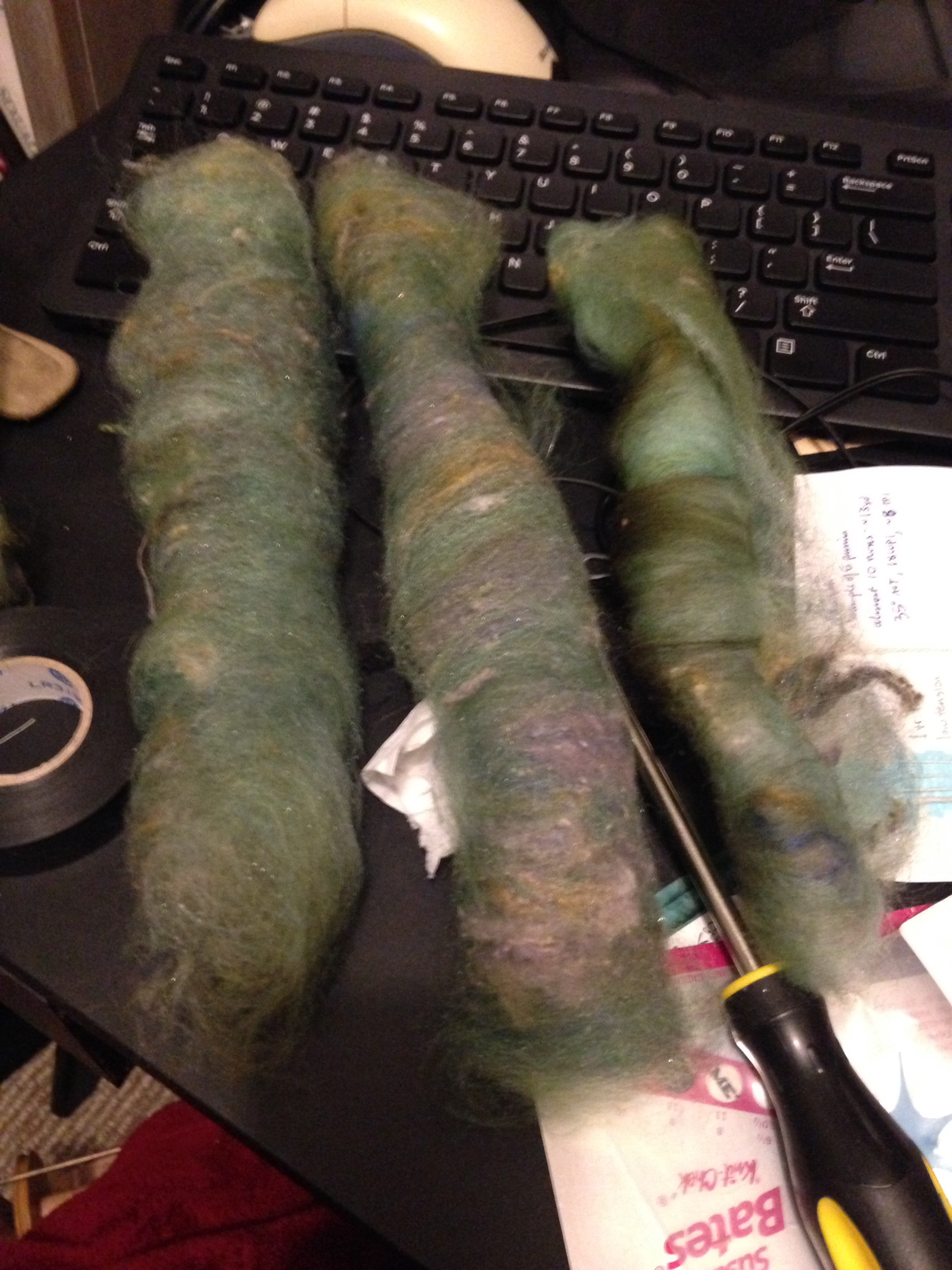 Below: Rolags. From right to left: no blending, one blending pass, two passes.
