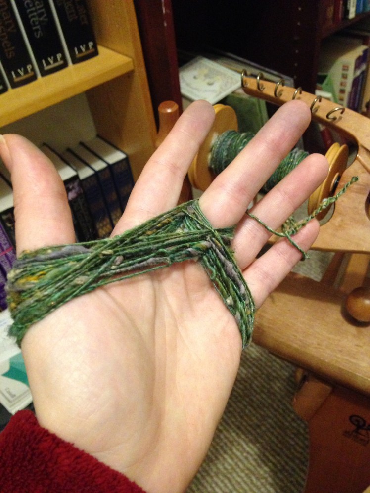 If you can’t tell, I ended up choosing to spin the combo ply (sample 2 above). And, in the interim between these posts, I’ve spun about three quarters of it. I’m very much hoping it’s finished by next week (though the Big Work Thing has its biggest push this week, so no promises). I can’t wait to ply it up and see how this story ends!