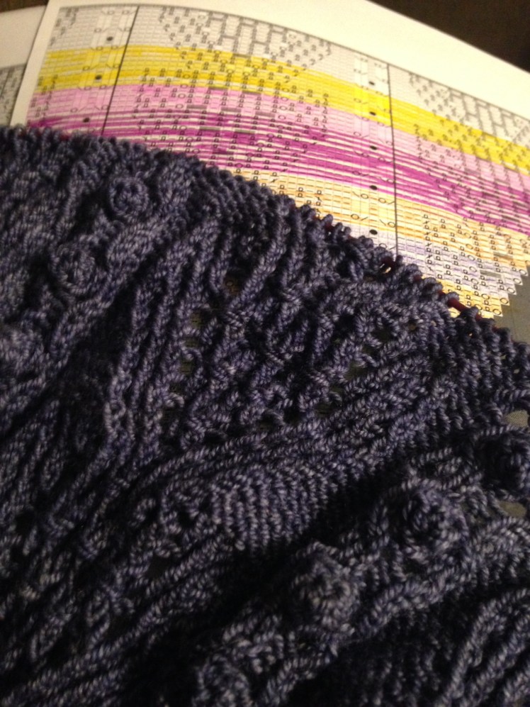 However, once I do pick it up, it’s really enjoyable. I’m into a nice rhythm, the chart is clear, and it’s got lots of nice benchmarks to feel like I’m progressing. The yarn is simply perfect for the pattern, and I’m working it at a good gauge for the needles. I really have no reason to complain.