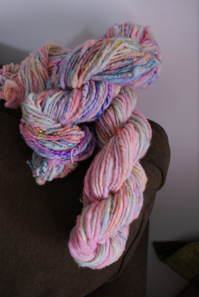 What I didn’t mention in the video because of all my excitement were the aspects that didn’t work. I was happy for this yarn to be thick and thin, which is a good thing, because I’m not very practiced at drafting merino, so there was no way it was going to be even. The downside of this is that my wheel is not really built to handle this kind of artyarn spinning. The yarn liked to get stuck in the oriface at every thick point, and the bumps sometimes got stretched out in the squeeze through, or they caught on the guide hooks. If I try corespinning again on this wheel, I’ll do it with a fiber I feel more comfortable drafting evenly, and/or with a less fluffy, out of control core. I’m already pondering the possibility of someday investing in a portable wheel with large oriface and bobbins for easier artyarn spinning. I could suffer through these difficulties for one spin, but I would hate doing this all the time. Ya need the right tools for the job.