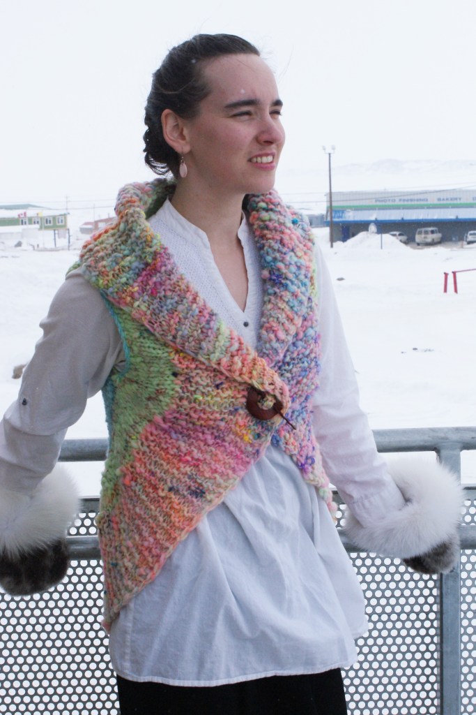 I’m offering this as a free pattern, mostly because it has not been test knit beyond what you see here. However, it is an extremely simple concept. Basically, you start knitting a top-down hat, but don’t stop increasing. The only fiddly bits are the armholes, and making sure you have enough yarn.
