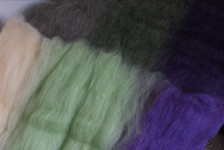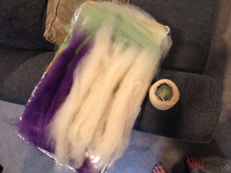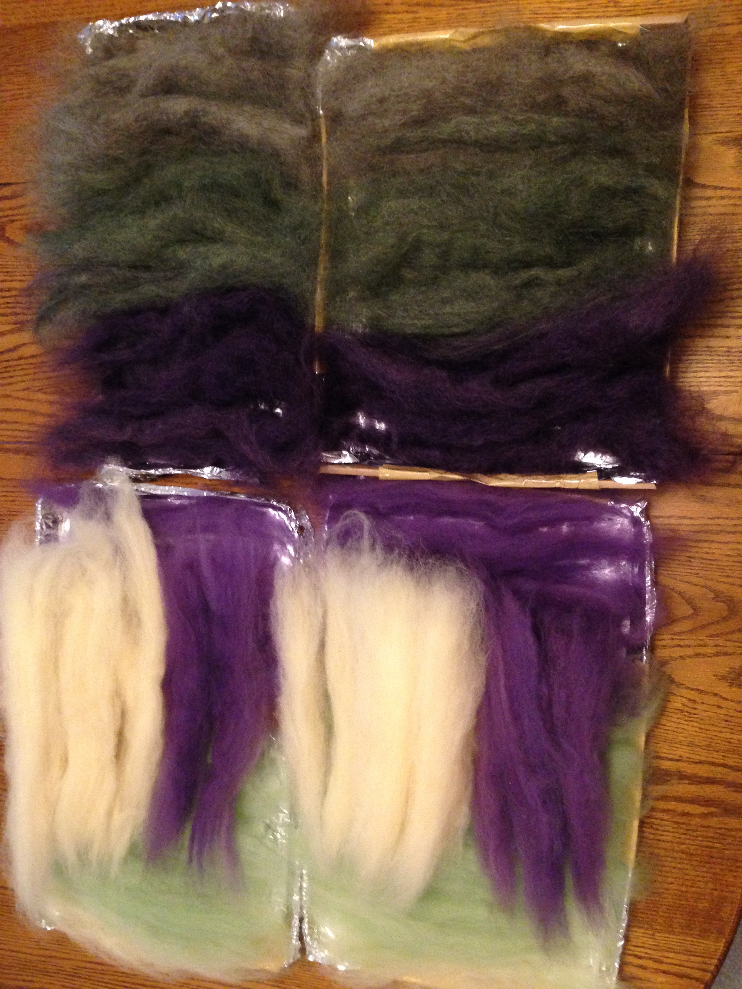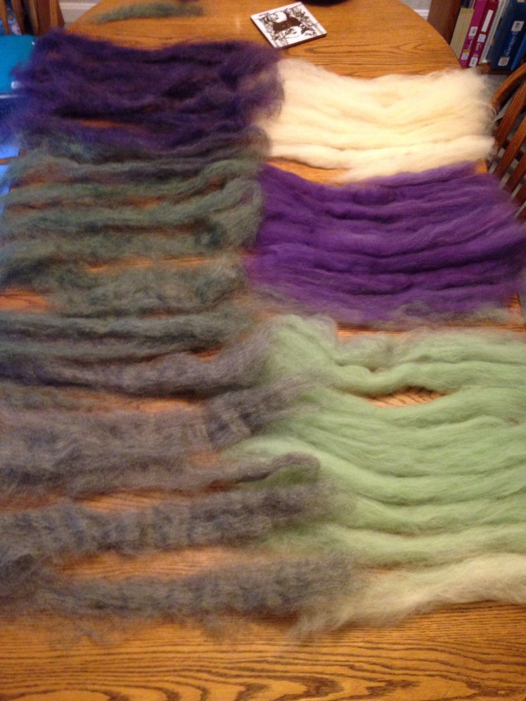I started matching different colors from the different batts, and came up with color pairings I was happy with. I best liked how the BFL yellow and the Gotland purple set each other off, and the Gotland green with BFL purple were also pleasing. (I apologize for these poorly-lit phone photos; they don’t give an accurate sense of the color pairings.) The BFL green and Gotland yellow I was less pleased with, but the light yellow dye went so subtly onto the Gotland that I don’t know if there’s anything I could do to keep it from just looking grey.