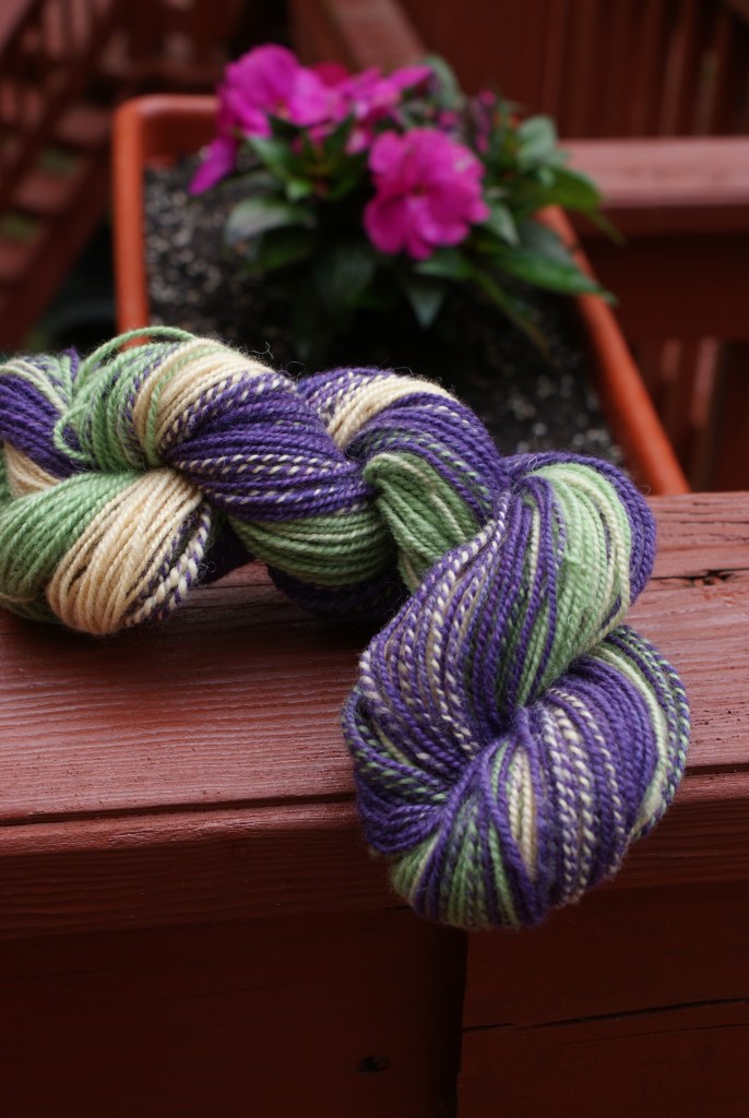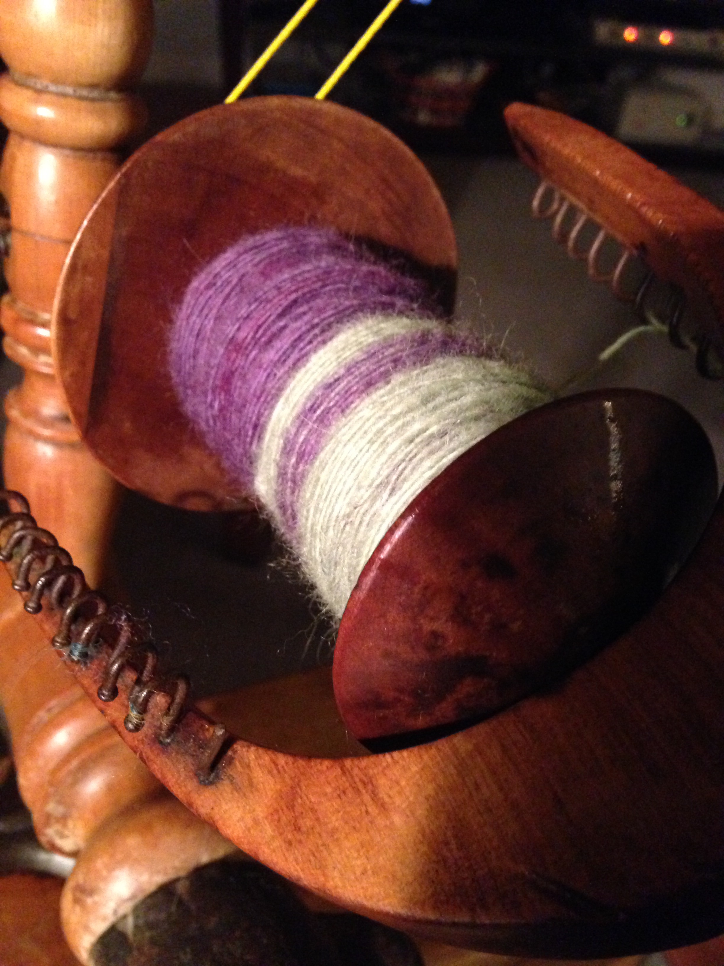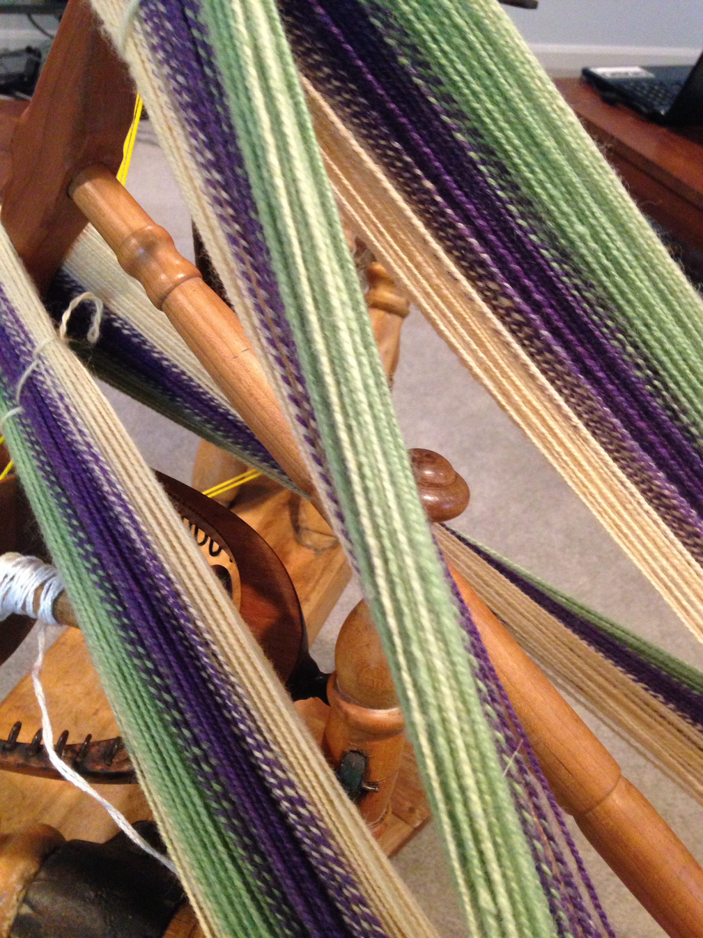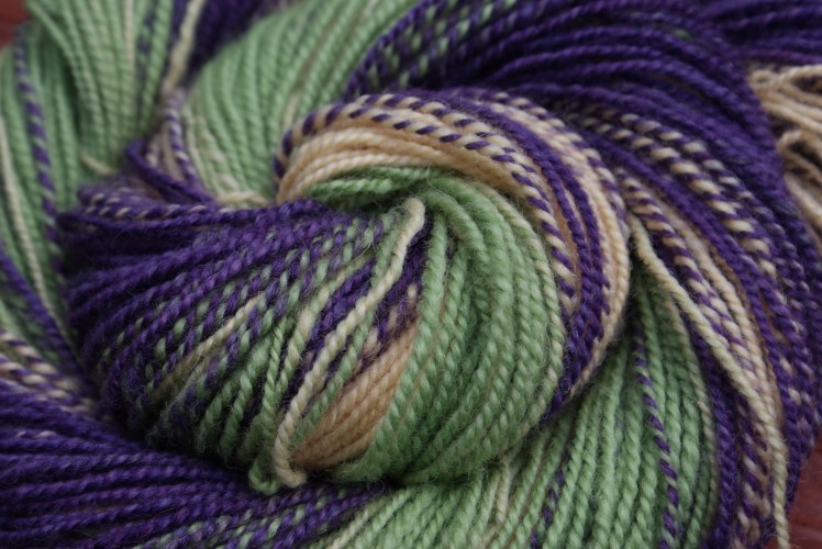 If you notice in the batt, the gradient includes sections of overlap between colors. I had rearranged this batt so the yellow and purple were next to each other, which were at the ends, so they were not carded together at any point. I preserved the sense of gradation with a little bit of combo drafting at the color change. It looks quite marled in the singles, but that was unavoidable with a value change like that. I put the green-to-yellow at the end of the yellow section; I don’t know if I’ll end up using it in the knitting.
