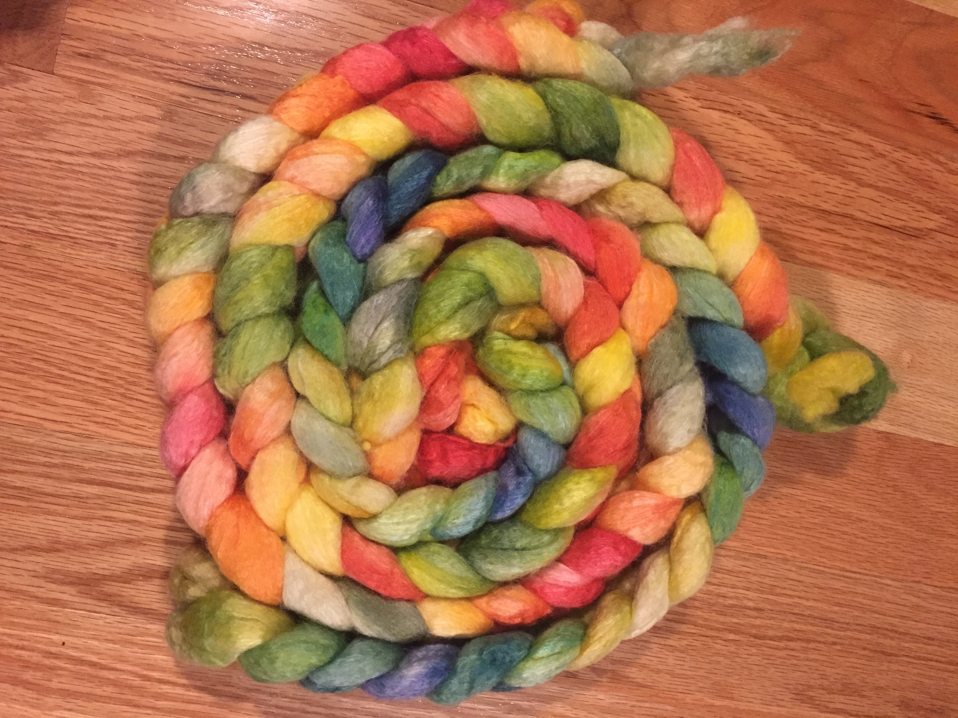 My current spin is 50/50 BFL/Tussah silk from Woolgatherings, in the colorway “Modern Love.” Purchased less than a month ago at Cloverhill. I’m spinning it for a Navajo-ply worsted-ish weight, in the ridiculous hope that it will be enough for a circular shawl-vest for my 4 year old.