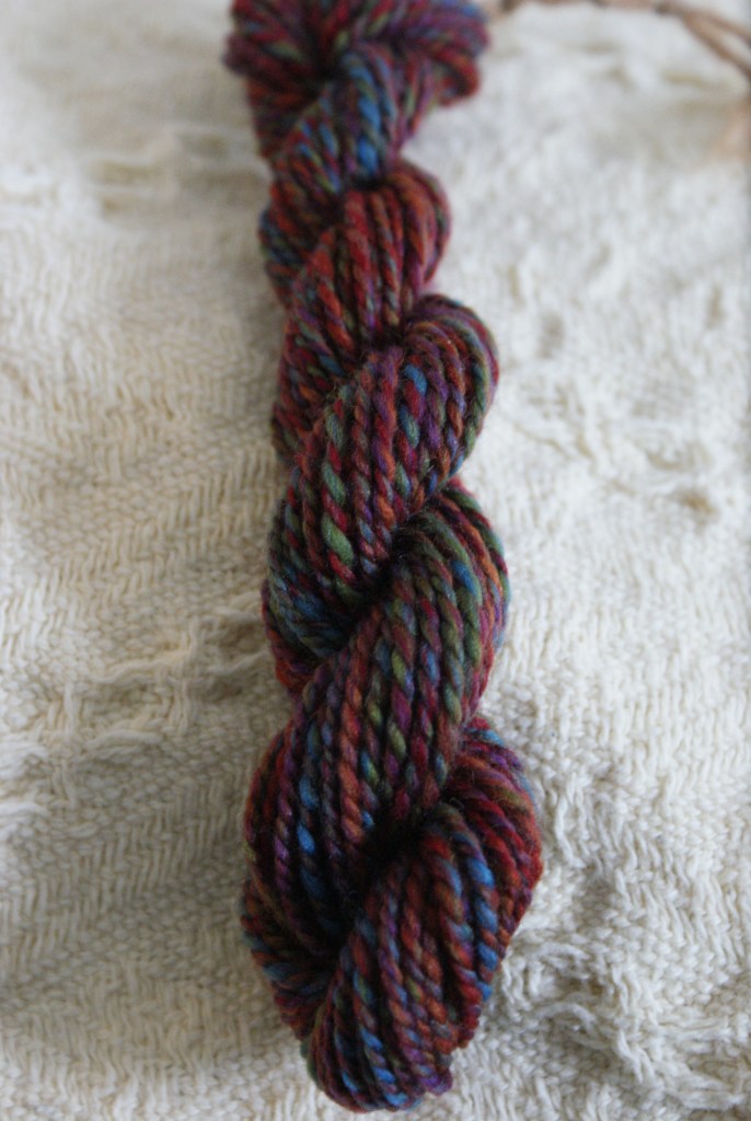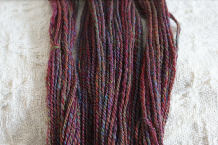 This first sample served as a sort of “control” for the experiment. Pre-drafting the top meant that I was drafting as many colors as possible at any one time. With the many hues in this top, blending them together as much as possible would make as much mud as possible. This is not as blended as it would be if I had, say, carded it together, but the optical blending is pretty thorough. This way we can also see the overall tone of the blend, which is a greyish purple-red.