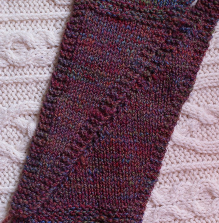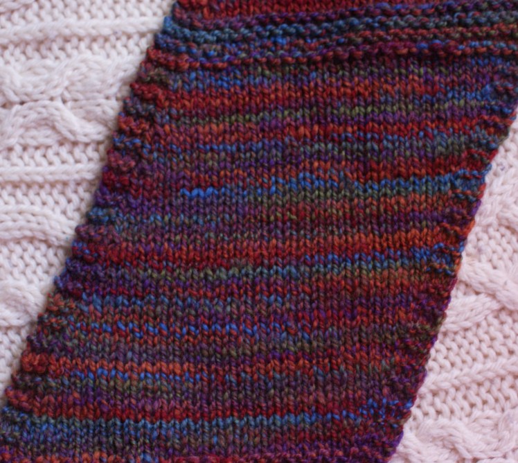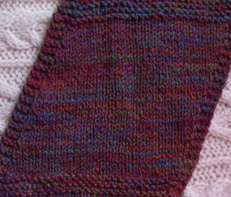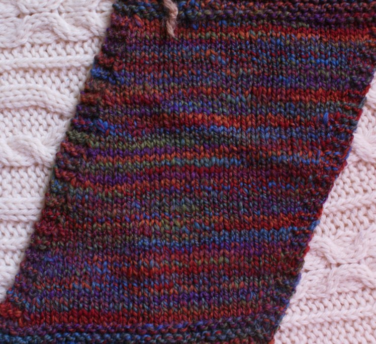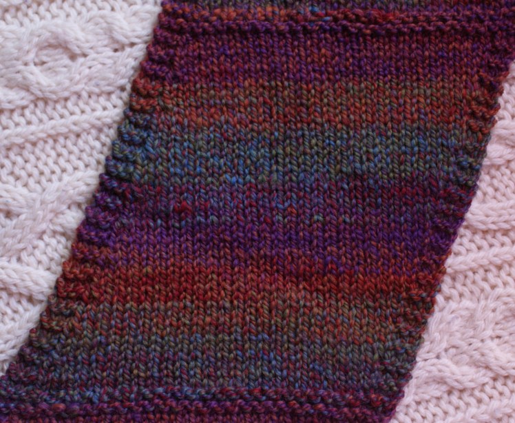 This final sample hardly differs from the other two, as both singles were really quite muddy. Some gentle emphases come through, because when a colour was occasionally strong in the Across the Top single, it was reinforced by its presence in the other single. This reinforcement of pop colours means that the yarn almost never looks barber piled. There’s not enough contrast. It’s got a little more visual ebb and flow than sample #1, and is definitely less uniformly purple.