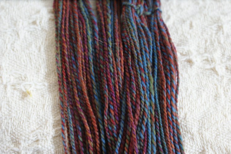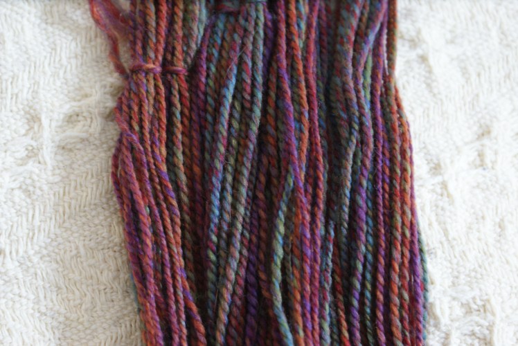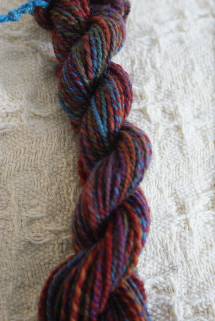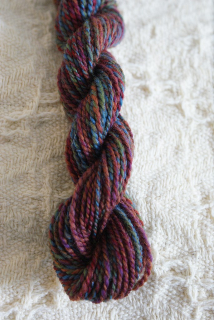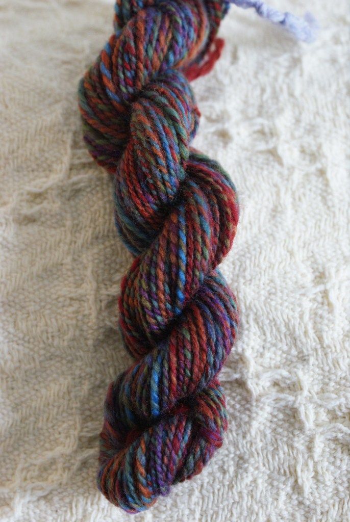 This was the sample I was most excited about. Since the drafting method made for very consistent stripes in the singles, and I plied them together starting at the same point in the color repeat, the colors matched up beautifully. There’s still a ton of complexity in the yarn, due to the fact that I was still drafting at least two colors at any one time, and the colors did not line up absolutely exactly. Who knows how this would work on a larger project, as the consistency in color repeats would drift eventually. But if there were a way to keep it exact, that would rock, because this is a really neat self-striping yarn!