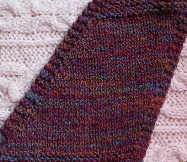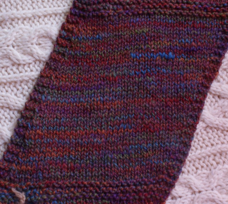 The stripes in this sample are the same length as in the traditional-2ply, but much more subdued, since the second ply was the purple-grey All Colors. I appreciate the subtlety of this effect, and the overall purple tone comes through. Note also that because the variation is only in one ply, this would be very easy to replicate in a larger project, because I wouldn’t have to worry about lining them up!