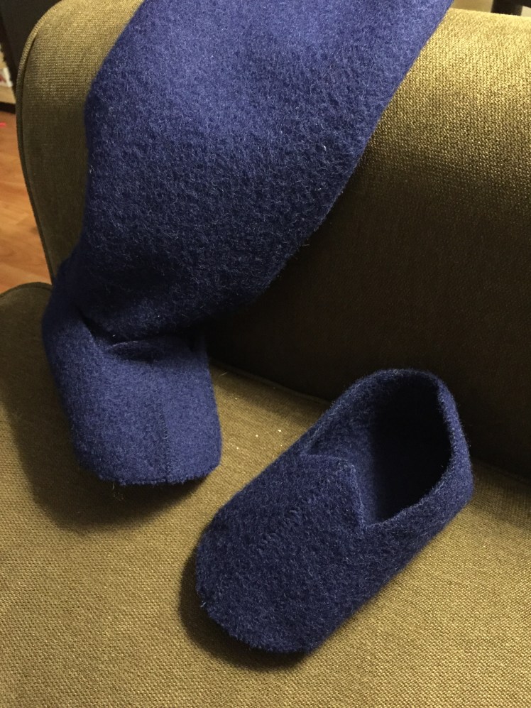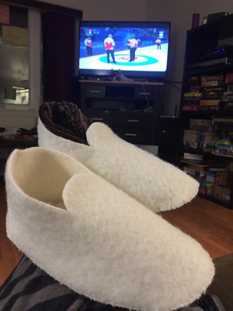 2) Duffel slippers (I know I’ve been told the word for slippers but I’ve forgotten/lost it; I’m hoping someone will jump in and remind me?). This is a layer of just the foot, shaped only a little different from the foot of the sock, and it’s usually also made from wool duffel.