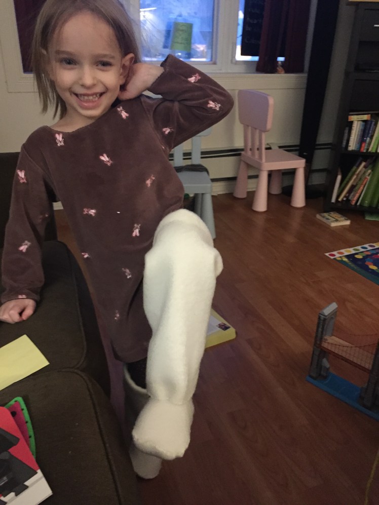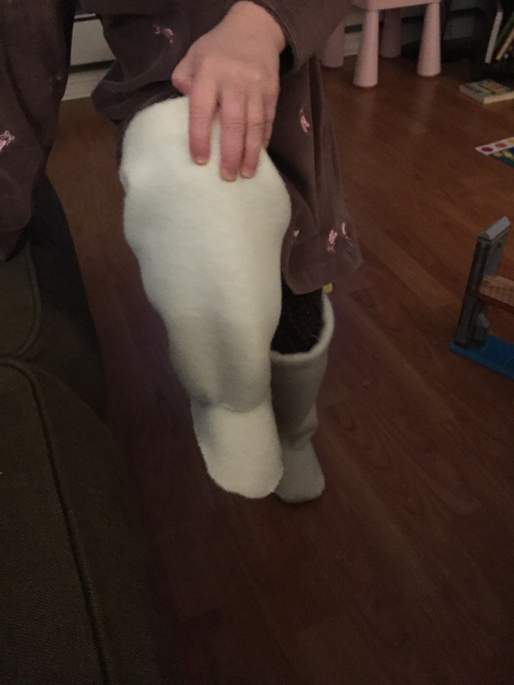 I had a promising start to the games, as within a couple of days I had N’s duffel socks cut and sewn together. But in my rush, I hadn’t waited for a pattern for her actual size; I adapted the patterns I had for M’s size. I also had not learned best practices with cutting a fabric as thick as duffel. To get all the pieces even, I had to trim and fuss until they only just fit her. The top of the feet were also slightly too short for the bottoms, with the architectural result of turned-up toes. And the legs were not too too short, but they only came up to her mid-knees.