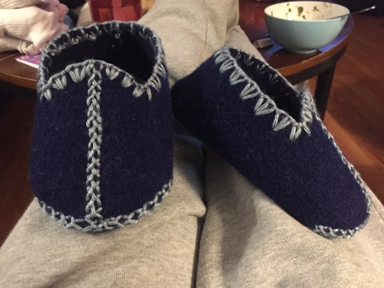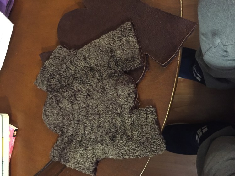 The sheepskin is really wonderful. I sewed it up and tried it on N, and she didn’t want to take them off. Here’s the problem: the duffel bottoms I made were too small; these duffel bottoms are too big! Like, a couple inches too big. And I couldn’t just adapt them into slippers, because they have a slightly different shape.