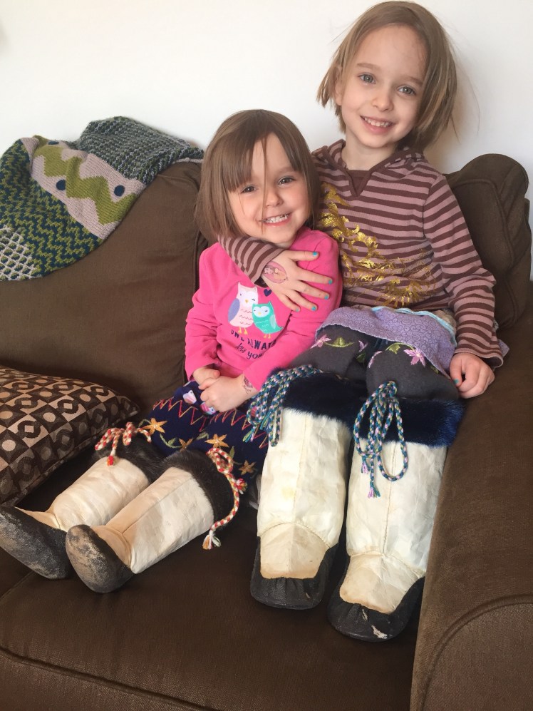 Those last few days had many gifts. Monday night at ACW, I had ptarmigan for the first time. That night, I finally got a decent night’s sleep. I’d been up almost every night for an hour or two. So I had specifically asked several people to pray for a good night’s sleep, and their prayers were answered. Tuesday I felt great, and had the surprise of lots of help so I could finish Naomi’s kamiik. Wednesday’s uncertainty had the joy of sharing those with her.