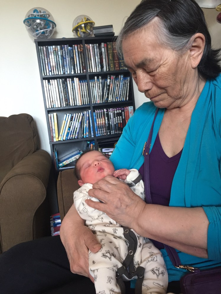 A note about names. In the past, we’ve had a name picked out well in advance, and just kept it private until baby was born. This time we only had a middle name picked out. Elisapee is my anaananguaq, which means something like “pretend mom,” and she’s become very special to us. It’s the Inuktitut version of Elizabeth. It perpetuates our accidental coincidence of non-English middle names starting with E. Reading lots of Elizabeth Zimmermann during third trimester sealed the deal for me. (I’m on my third Tomten jacket.)