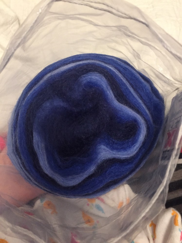 I count three distinct shades of blue, and four repeats of color. Lots of interesting options for color management, though I’m pretty sure it’s meant to be spun from the centre.