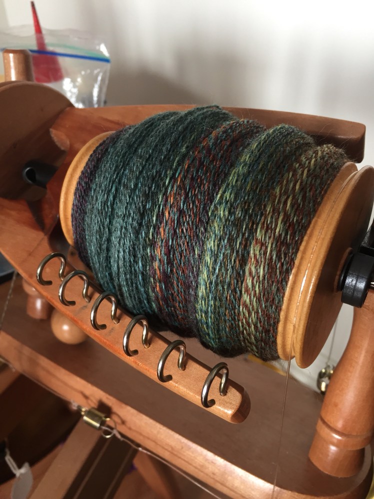I had a similar problem with my big red sweater quantity spin, which is why I didn’t blog about it. It looked underplied to me at the end, though my peers weren’t sure they agreed. Before putting such a large quantity (1400 yards) back through the wheel, I want to be sure it’s necessary. To determine that, I should really knit up a wearable swatch like a wrister and see how it wears. I realized I wasn’t ready for that step, so I called the yarn finished and put it away, to deal with the wear question when I’m ready to knit with it next.