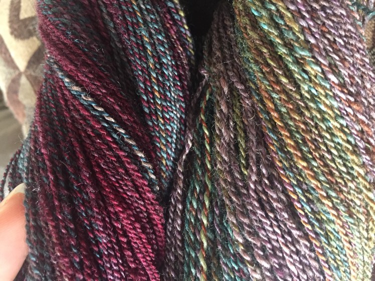 I just love the final yarn. Overall I got 1130 yards, which at 7.3 oz makes a grist of 2476 ypp. That’s within shooting distance of my sample grist of 2882 ypp, measured as accurately as possible for me. (As in I enlisted the help of my friend the pharmacist and her uber-accurate scale.)