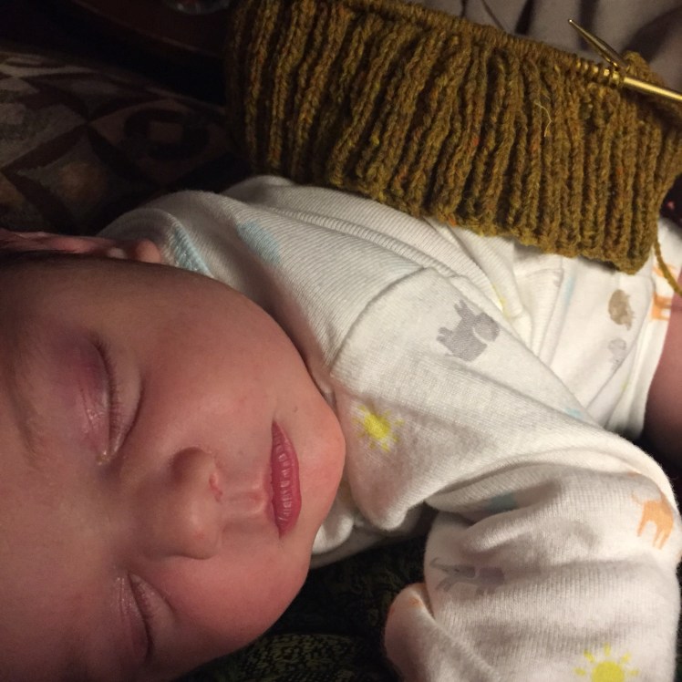 Back to the suitcase picture. The red bag, out of which you see two yarn cakes peeking, is the one knitting project I’m bringing along. It’s a fingering weight yoke sweater that I cast on right after baby was born.