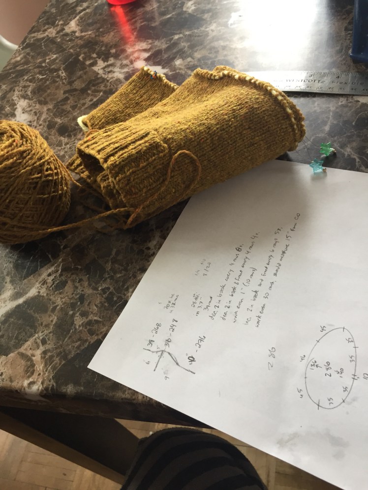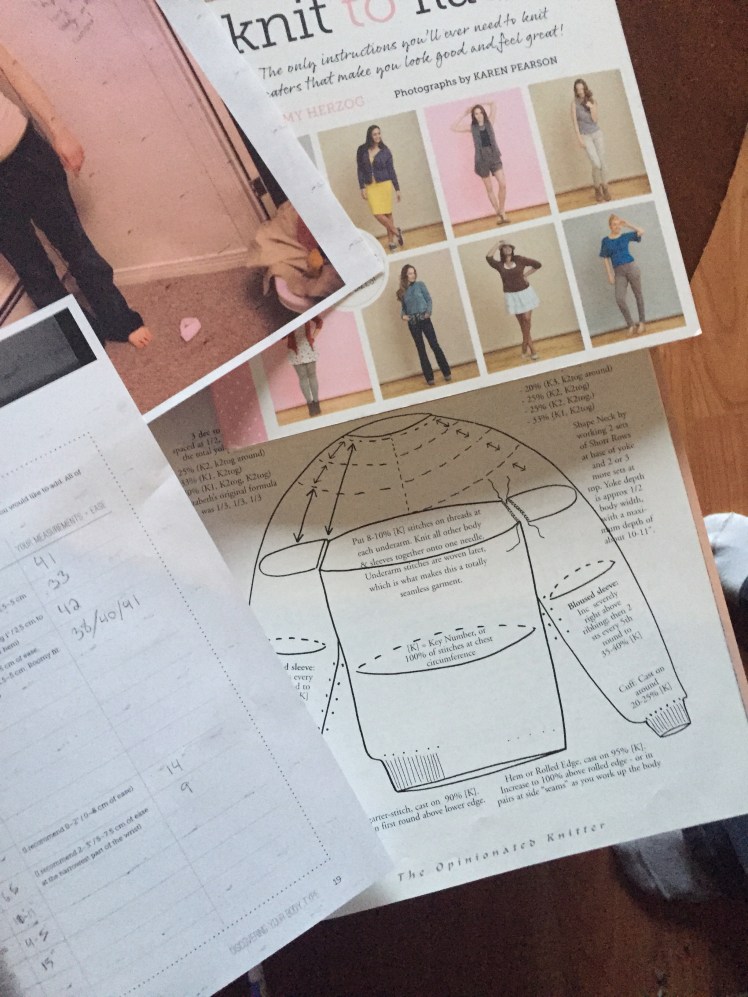 I tried her whole experiment of taking pictures of myself and drawing lines on it, and it was fascinating. You may think that this was not, perhaps, the best idea to do this immediately postpartum. But it was a good opportunity to get to know my body again, and with my little girls helping me take pictures, to practice unflinching, no-exceptions body positivity. If I make a sweater that’s a bit big on me in a year, all the better.