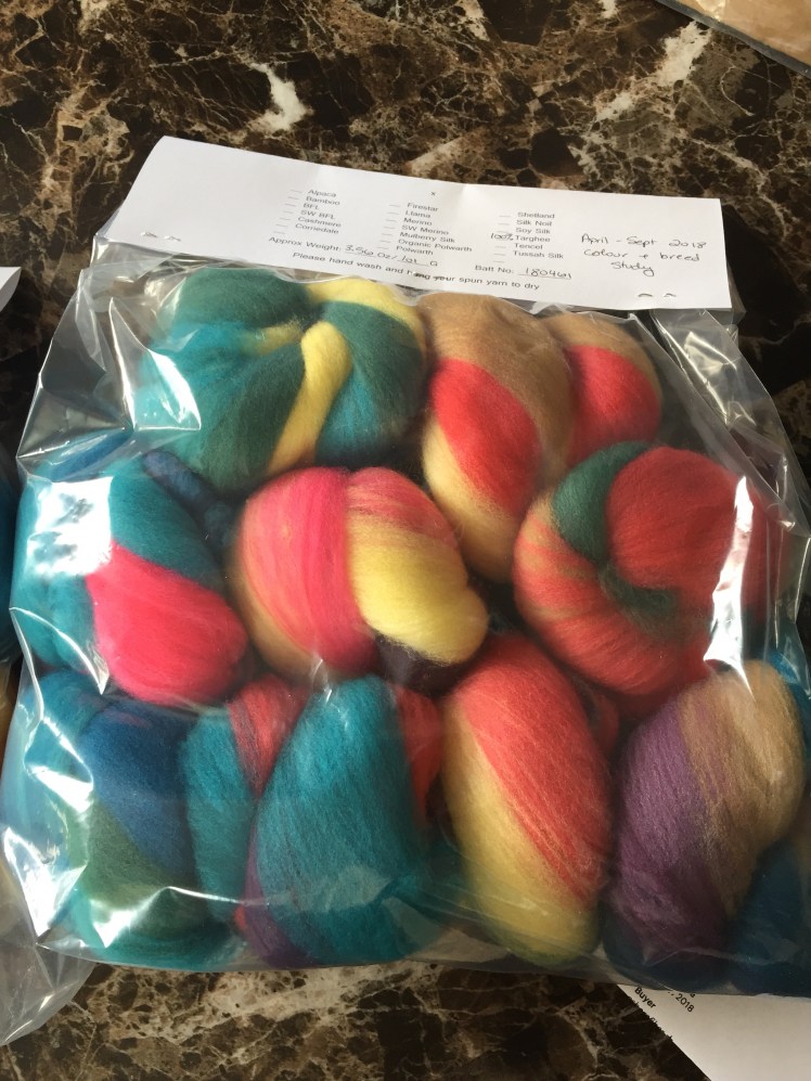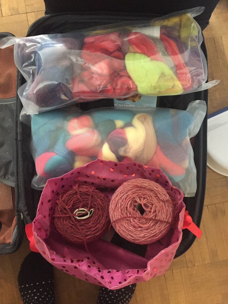 In the vacuum bags pictured on the suitcase, the top one is an amalgam project I’ll have to introduce later. I’ve long been planning it as my Tour de Fleece spin. The centre bag is what you see directly above: the latest Wool N Spinning / Crafty Jaks breed and color study. It’s a wild riot of color on targhee, and I love it. I caved and decided to bring it when I realized the plan I’d settled on was something I could do on spindles.