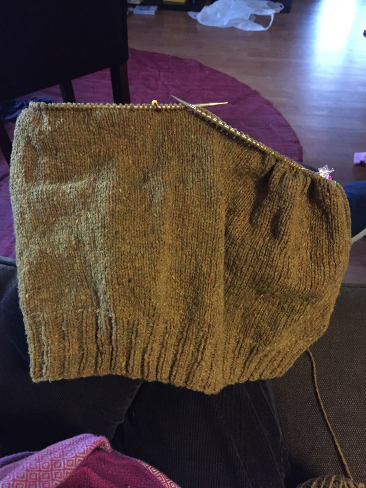 It’s an amalgam of Elizabeth Zimmerman’s original fair isle yoke sweater, documented in The Opinionated Knitter and other volumes, and I will cardiganize it and decorate the yoke with patterning from Susan Pandorf’s “Rohan” cape. It had been growing steadily when discussions of sweater fit started cropping up in the Wool N Spinning community, leading me to buy one of Amy Herzogs books.