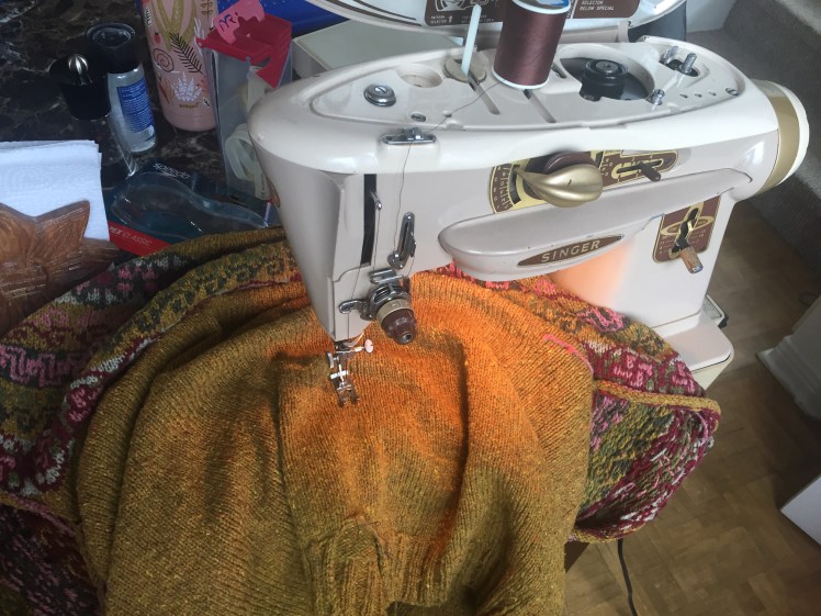 Seeing this helps me decide what to do with the collar. I think that nicely pulling-in hem should be matched with a collar that’s not too low. So to combat the risk of it being falling-off big, I’ll make a nice tall, tight ribbed collar next. I should reinforce the neck hem with some ribbon as well. Better dig some up.