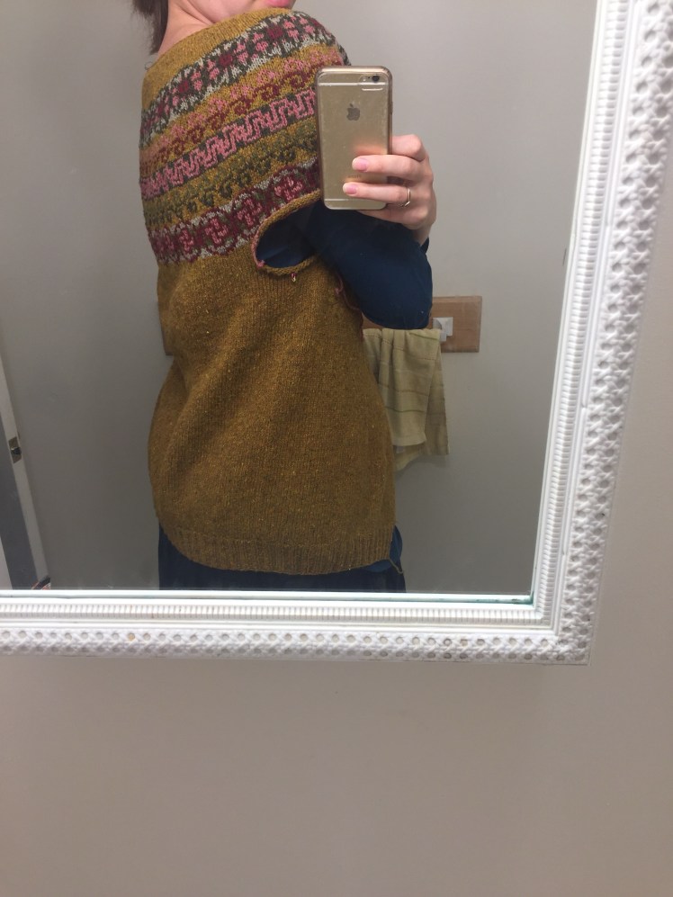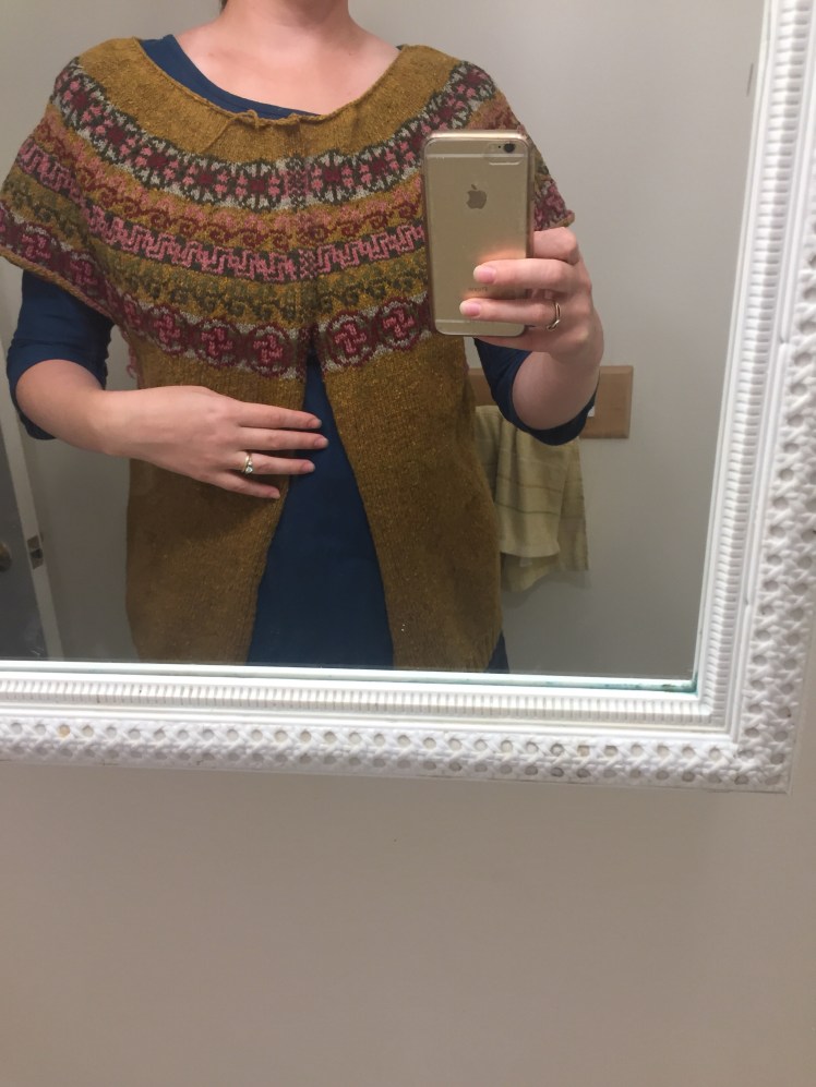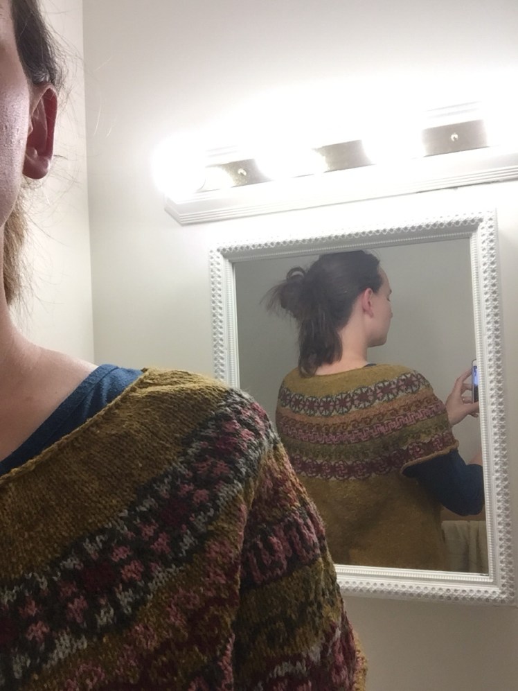 The neck is pretty wide, and the whole yoke is pretty big. It’ll only get bigger when I block it properly. My swatch may have lied horribly when it said I should use the same size needles for the fair isle as the plain. I wanted a slouchy fit, but I don’t want it falling off. I’m going to be optimistic and say it’s not too big, but I’ll be careful in the blocking not to stretch.