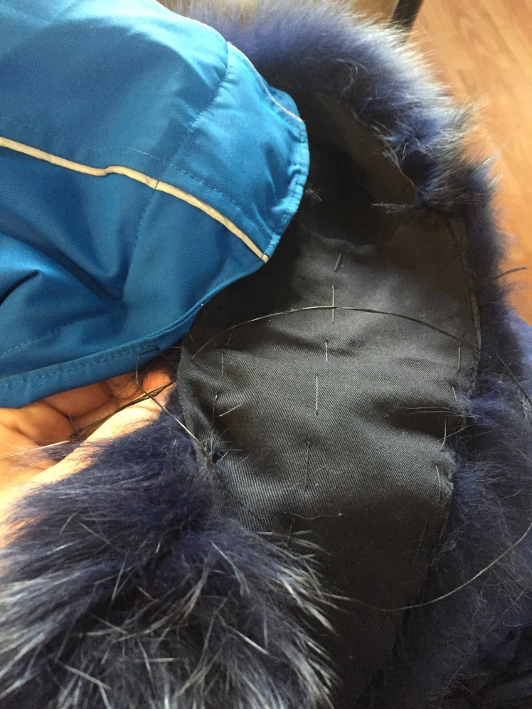 This being September, I knew it was time to hop to it. I could not have chosen an easier reentry into sewing. I learned from examining our handmade parkas from Nunavik that the fur only has to be tacked on very loosely – we’re talking centimetre-long stitches.