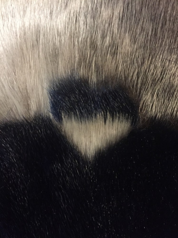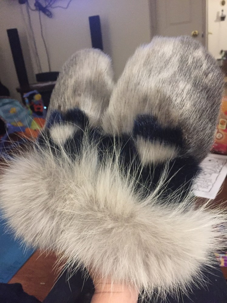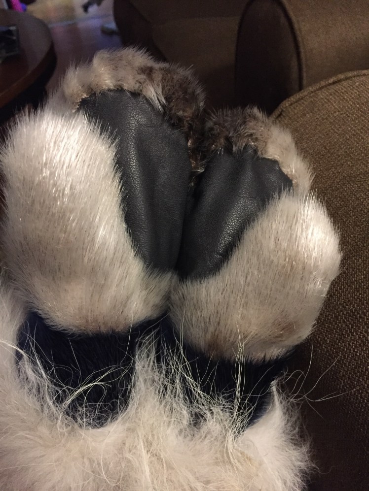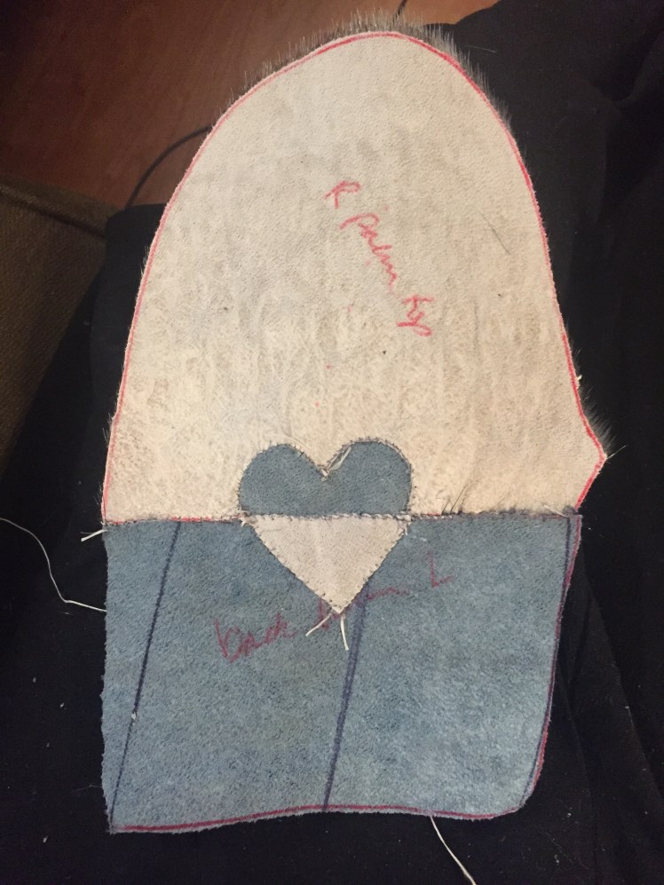 The design evolved thusly: her favorite color is blue. I didn’t have enough blue sealskin left (from my hat which was stolen, sniff) for a whole pair, but I probably had enough for a sort of two-tone look. Two halves in different colors just makes one extra seam per mitt, right?