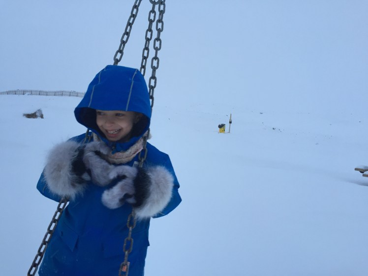 They’re big on N yet. It’s hard for her to carry or hold anything in them. And the cuffs seem to conflict with the cuffs of her coat; we haven’t quite figured that out yet. Anyway, I sure hope she takes good enough care of them that she can grow into them and pass them on!