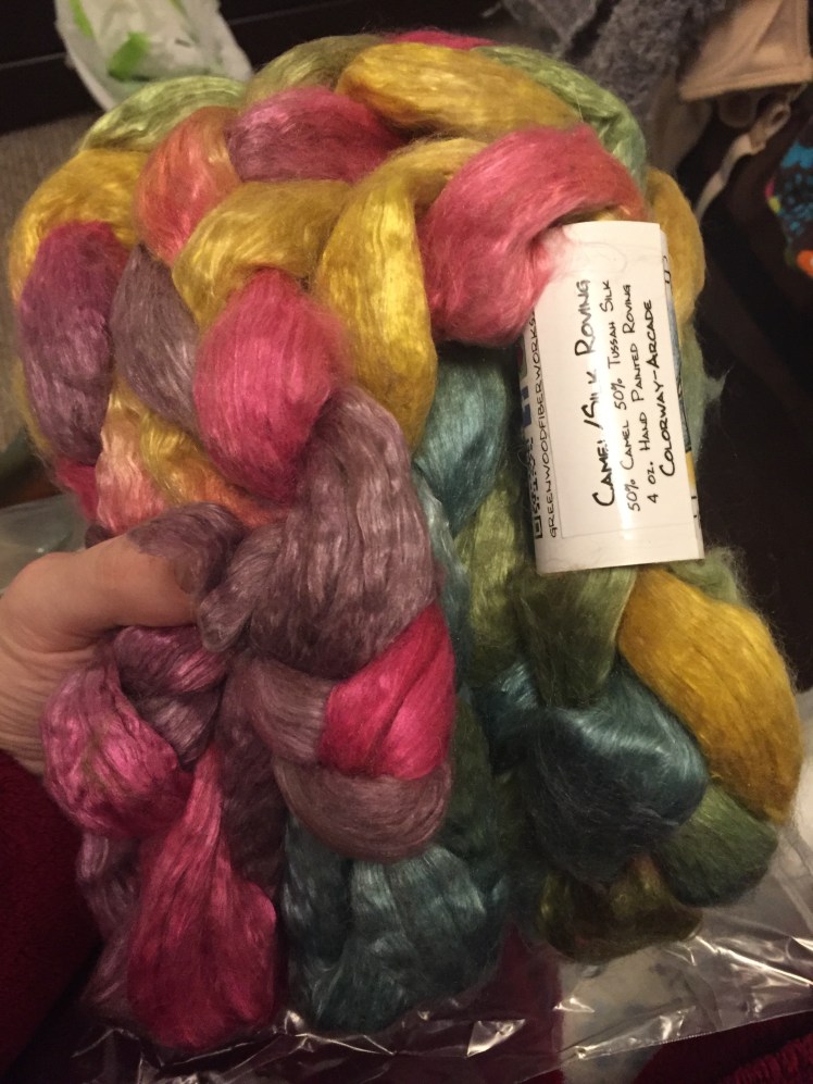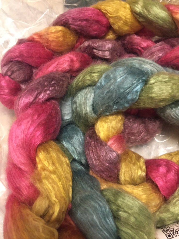 Oh me, oh my! This is a 50/50 yak/silk braid from Greenwood fibres. In such happy spring colors. What perfect timing, with the weather blowing snow and cloudy all week. I don’t mind the monotone of our winters, but a bit of indoor color suits me just fine.